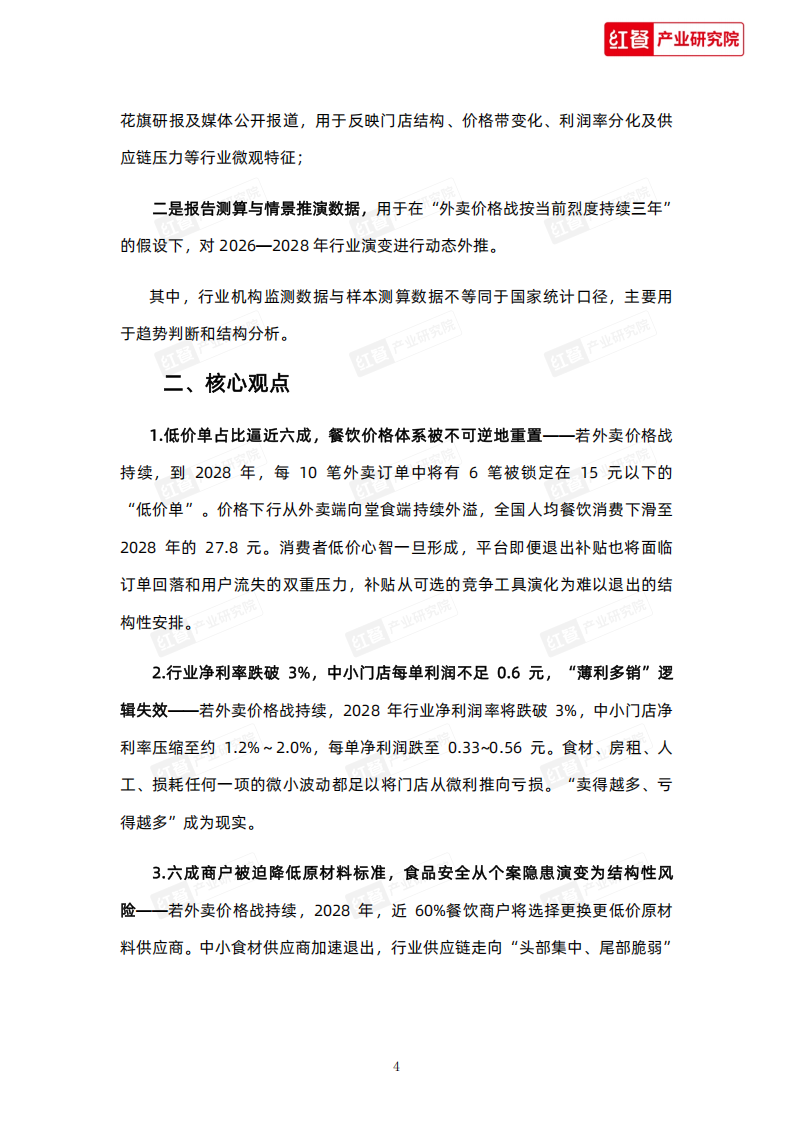 二是报告测算与情景推演数据,用于在“外卖价格战按当前烈度持续三年”的假设下,对2026—2028年行业演变进行动态外推。