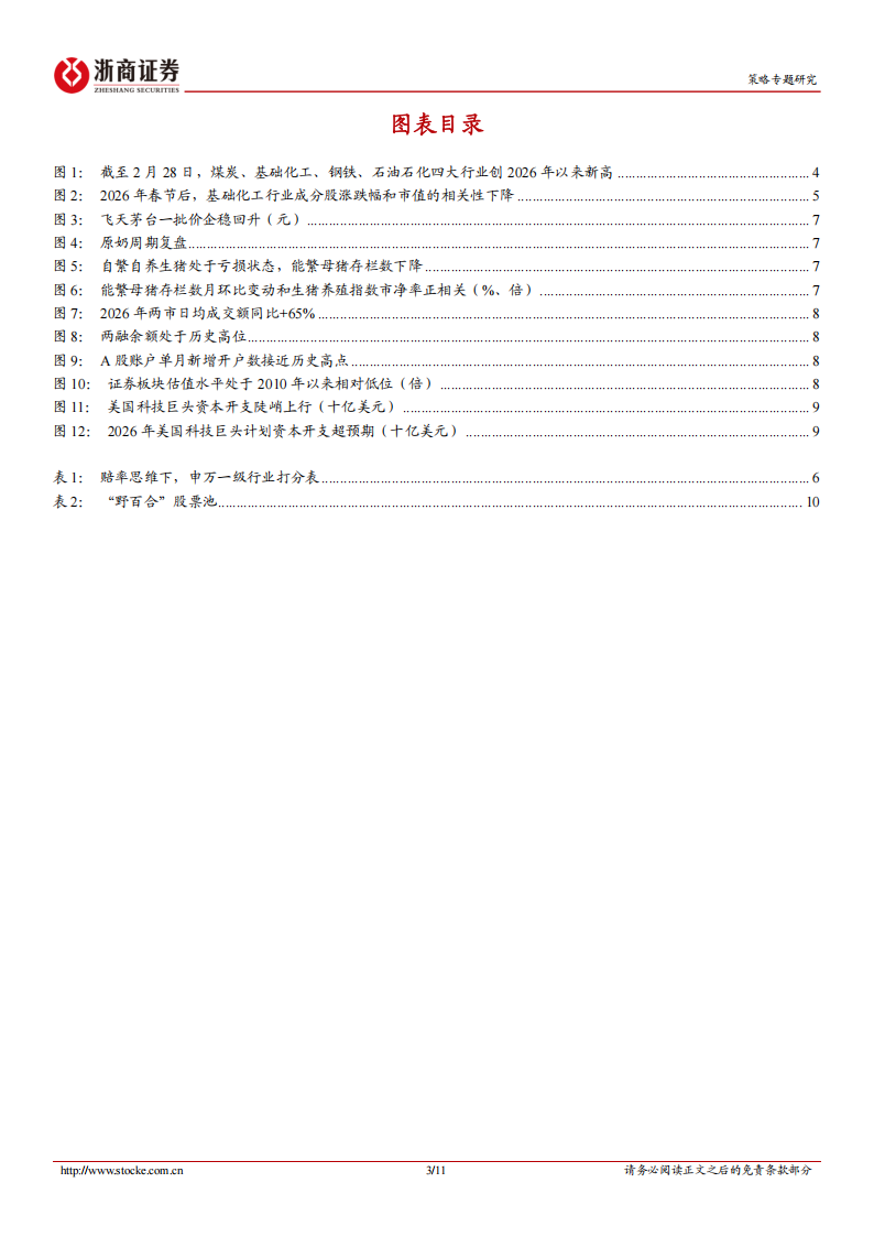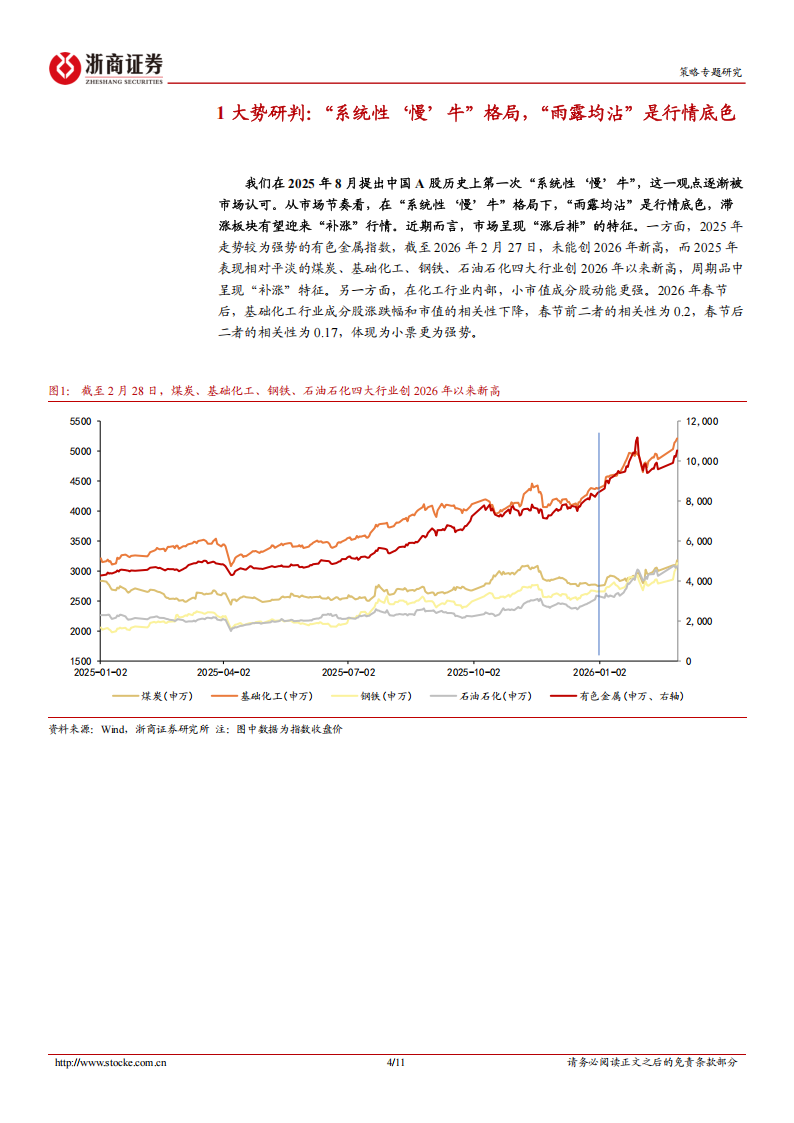 我们在2025年8月提出中国A股历史上第一次“系统性‘慢’牛”。在“系统性‘慢’牛”格局下,“雨露均沾”是行情底色,滞涨板块有望迎来“补涨”行情。近期而言,市场呈现“涨后排”的特征。一方面,2025年走势较为强势的有色金属指数,截至2026年2月27日,未能创2026年新高,而2025年表现相对平淡的煤炭、基础化工、钢铁、石油石化四大行业创2026年以来新高,周期品中呈现“补涨”特征。另一方面,在化工行业内部,小市值成分股动能更强。2026年春节后,基础化工行业成分股涨跌幅和市值的相关性下降,春节前二者的相关性为0.2,春节后二者的相关性为0.17。