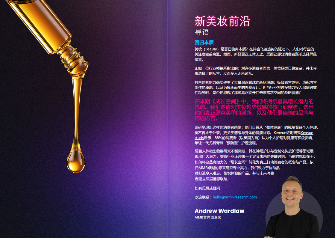 我们提炼出塑造下一个美妆创新时代的十大驱动因素。它们共同为市场人与创新者提供了一条清晰的路径:将洞察转化为产品概念,将概念转化为消费者真正愿意选择的产品。