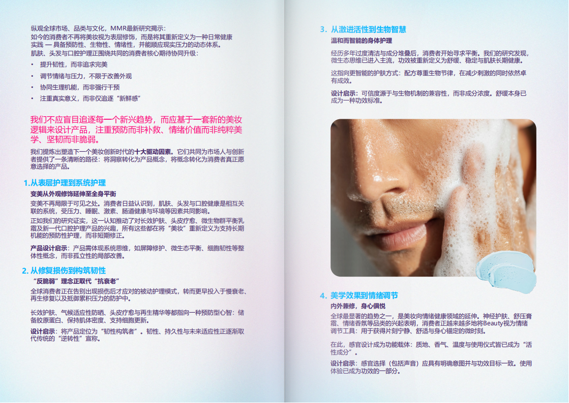 正如我们的研究证实,这一认知推动了对长效护肤、头皮疗愈、微生物群平衡乳霜及新一代口腔护理产品的兴趣,所有这些都在将“美妆”重新定义为支持长期机能的预防性护理,而非短期修正。