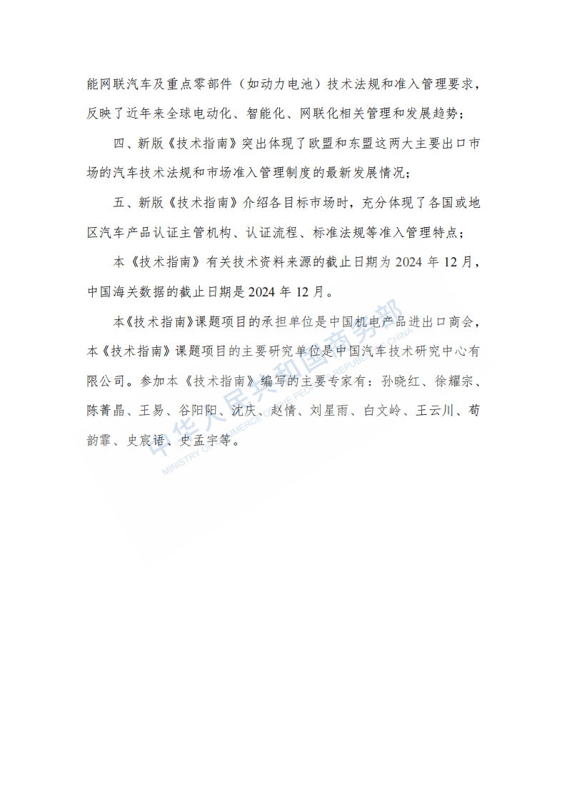 本《技术指南》课题项目的承担单位是中国机电产品进出口商会,本《技术指南》课题项目的主要研究单位是中国汽车技术研究中心有限公司。参加本《技术指南》编写的主要专家有:孙晓红、徐耀宗、陈菁晶、王易、谷阳阳、沈庆、赵情、刘星雨、白文岭、王云川、苟韵霏、史宸语、史孟宇等。