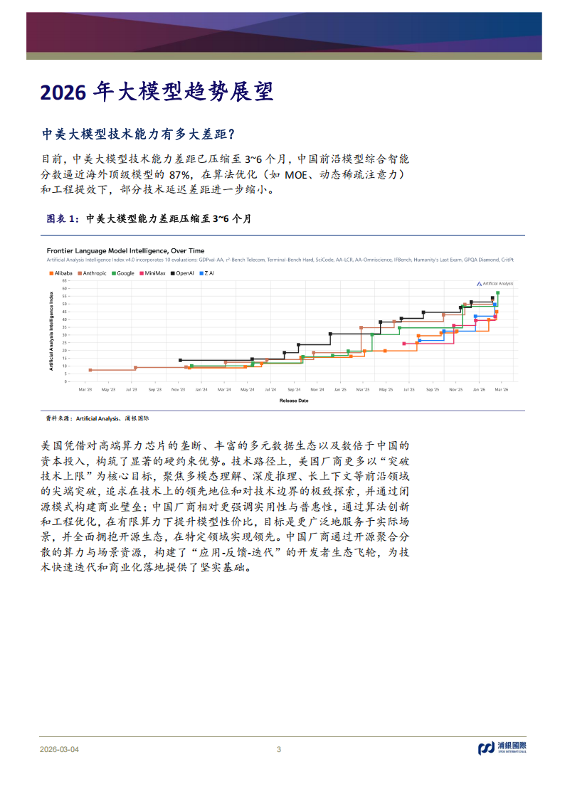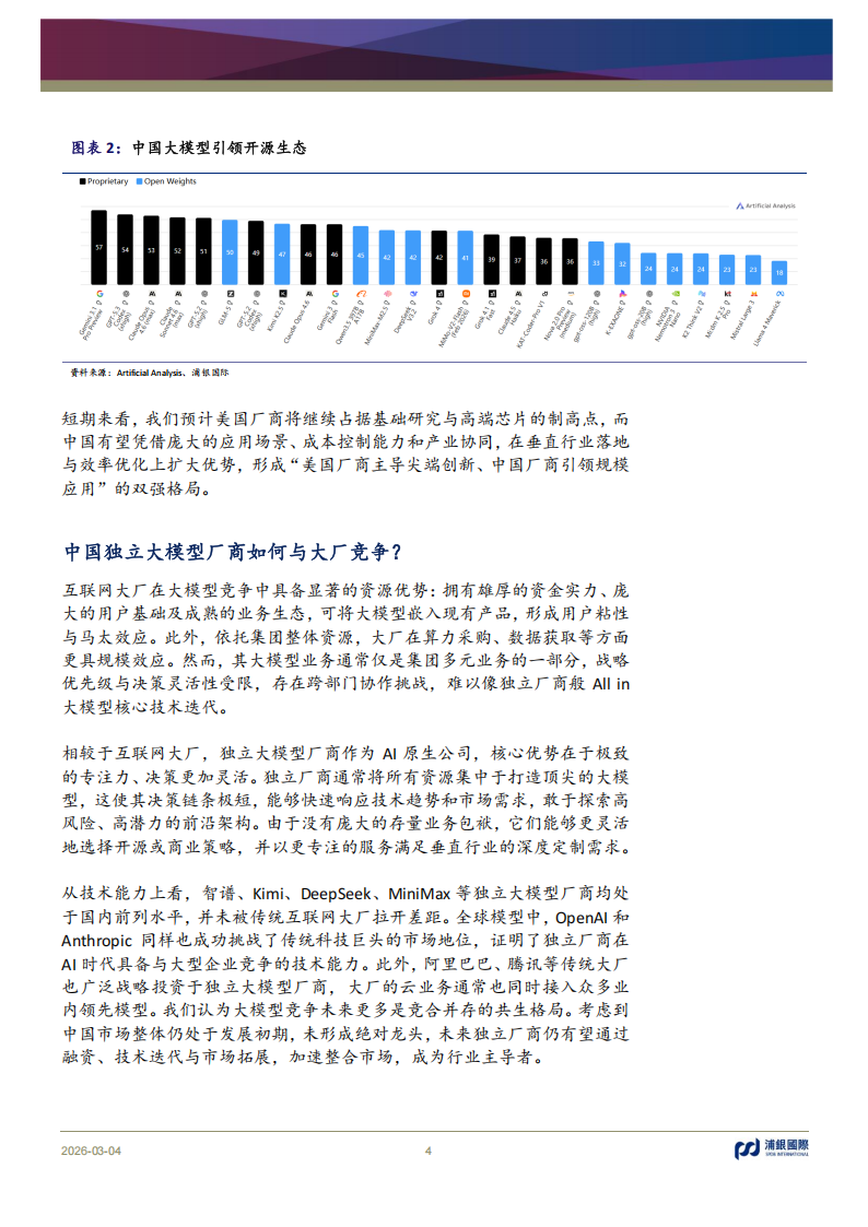 .2026年大模型趋势展望:1.中美差异:据Artificial Analysis 榜单,当前中美大模型技术差距已压缩至3~6个月,国内前沿模型综合水平逐渐逼近海外顶级模型,不过美国厂商更注重尖端技术创新,国内厂商重点聚焦场景落地与开源生态构建。2.竞争格局:中国独立大模型厂商凭借决策灵活性,与互联网大厂将呈现分层竞合、互补共生格局,大厂以算力、数据、生态主导通用基座与C端场景,独立厂商聚焦垂直技术、开源创新。3.商业变现:短期 To B模式具备更强稳健性与确定性,从长期潜力来看,To C模式更具想象空间。由于巨头对国内流量把控,独立厂商To C国内生存空间被压缩,出海机会更大。4.盈利预期:大模型行业普遍处于亏损状态,核心制约因素为算力投入、研发成本及获客成本,短期难以实现盈利,盈利关键在于提升商业变现以及优化推理成本等。