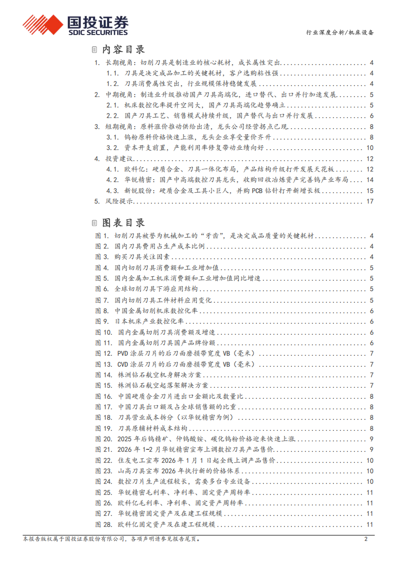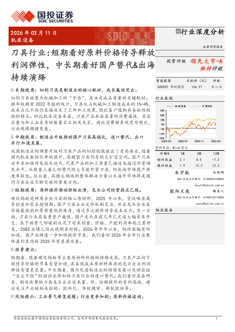 短期看,随着碳化钨粉等主要原材料价格的持续走高,刀具产品向下游传导价格的节奏有望加速,具备低成本原材料库存的龙头企业利润弹性有望更显著。中长期看,国内先进制造业的持续发展以及供应链“自主可控”的强诉求将加快刀具行业的进口替代。我们看好具备研发、制造优势的刀具龙头企业迎来量、价、份额提升的有利局面,建议关注产业链相关标的:欧科亿、华锐精密、新锐股份等。