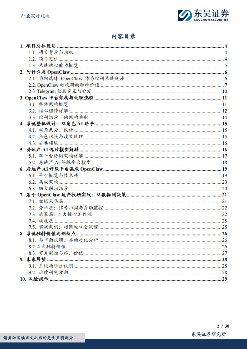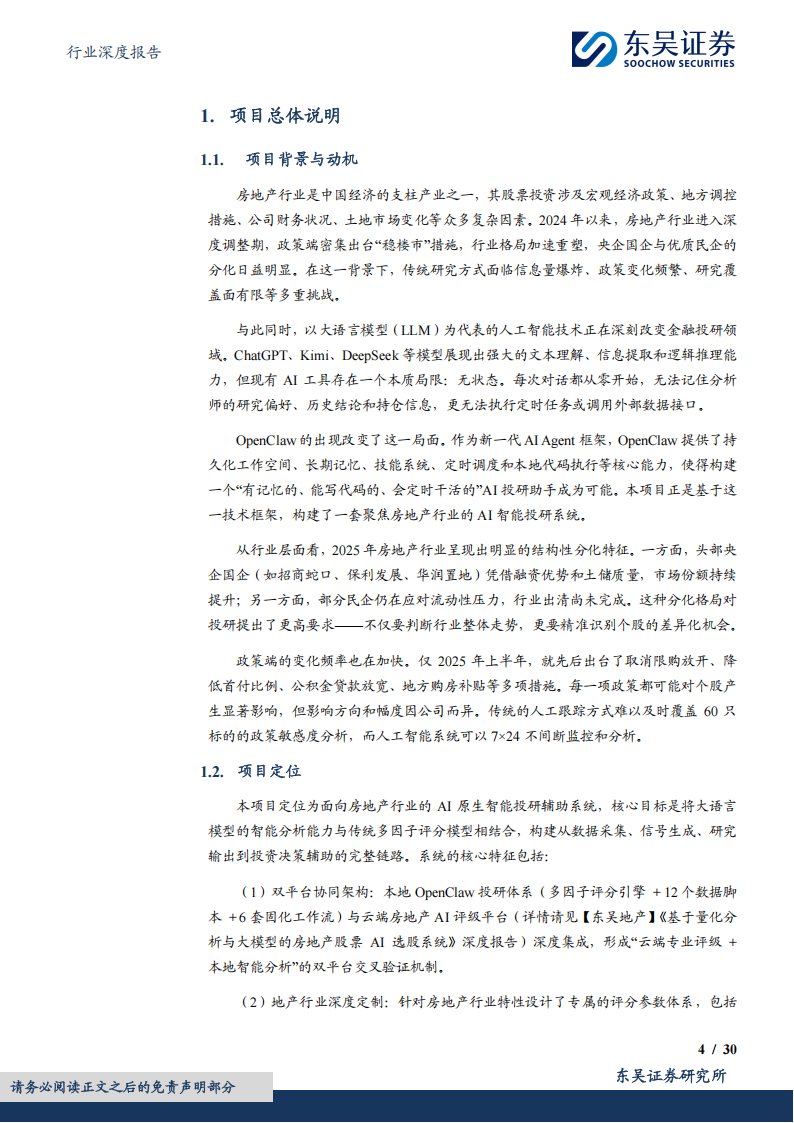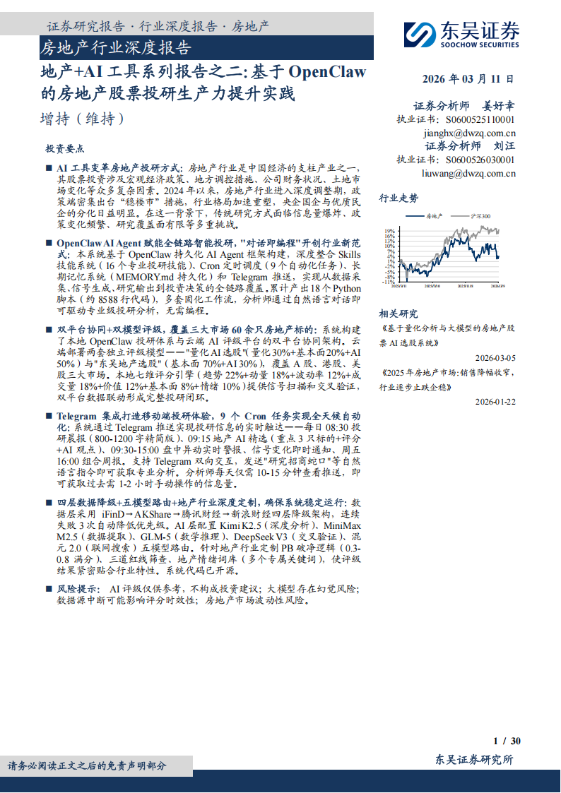(1)双平台协同架构:本地OpenClaw投研体系(多因子评分引擎+12个数据脚本+6套固化工作流)与云端房地产AI评级平台(详情请见【东吴地产】《基于量化分析与大模型的房地产股票AI选股系统》深度报告)深度集成,形成“云端专业评级+本地智能分析”的双平台交叉验证机制。