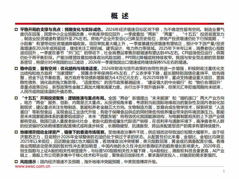 平稳开局的支撑与亮点:预期变化与实际成色。2026年经济增速目标区间下移,为不确定性留有空间。制造业景气度仍在回落,民营中小企业预期改善,中美库存低位回升,一季度叠加“两新”“两重”、“十五五”投资前置发力,制造业投资增速有望回升至2%左右。房地产企业开发信心已降至历史低位,房地产投资增速仍处下行探底期,“小阳春”有望带动投资增速降幅收敛。项目审批量大幅上升,一季度基建投资增速有望转正,预计中下游产量/投资高增速在2026年或将延续,继续关注工程机械、建筑设计、电力热力等领域。2025年下半年以来,消费者信心指数波动回升,一季度在春节“开门红”的带动下,社会消费品零售总额增速有望达到4%左右。CPI延续低位运行,供需仍处于再平衡阶段。产能治理显效叠加地缘政治风险加剧,PPI同比降幅或将持续收窄。我国与安全型走廊的贸易联系密切,将部分对冲我国的出口波动,2026年一季度我国出口增速或将继续保持5%左右的增速。