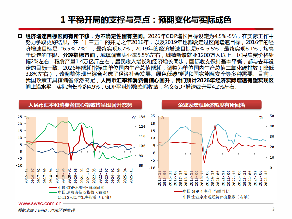 经济增速目标区间有所下移,为不确定性留有空间。2026年GDP增长目标设定为4.5%-5%,在实际工作中努力争取更好结果。在“十三五”的开局之年2016年,以及2019年也都设定过区间增速目标,2016年的经济增速目标是“6.5%-7%”,最终实现6.7%,2019年的经济增速目标是6%-6.5%,最终实现6.1%,均高于设定的下限。分项指标方面,城镇调查失业率5.5%左右,城镇新增就业1200万人以上、居民消费价格涨幅2%左右、粮食产量1.4万亿斤左右,居民收入增长和经济增长同步,国际收支保持基本平衡,都与去年设定的目标一致。2026年能耗指标由单位国内生产总值能耗,调整为单位国内生产总值二氧化碳排放(降低3.8%左右),该调整体现出综合考虑了经济社会发展、绿色低碳转型和国家能源安全等多种需要。目前,我国政策工具箱储备依然充足,人民币汇率和消费者信心回升,我们预计2026年经济实际增速有望实现区间上沿水平,实际增长率约4.9%,GDP平减指数降幅收敛,名义GDP增速或升至4.2%左右。