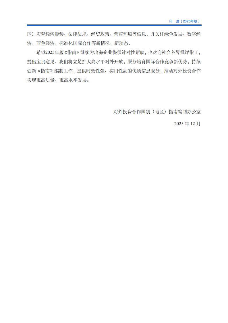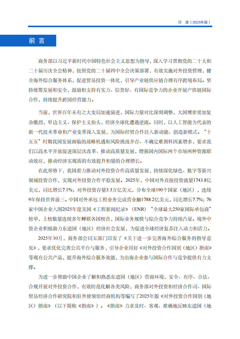 为进一步帮助中国企业了解和熟悉东道国(地区)营商环境,安全、有序、合法、合规开展对外投资合作,有效防范化解各类风险,商务部对外投资和经济合作司、国际贸易经济合作研究院和驻外使领馆经商机构等编写了2025年版《对外投资合作国别(地区)指南》(以下简称《指南》)。《指南》力求及时、客观、准确地反映东道国(地区)宏观经济形势、法律法规、经贸政策、营商环境等信息,并关注绿色发展、数字经济、蓝色经济、标准化国际合作等新情况、新动能。