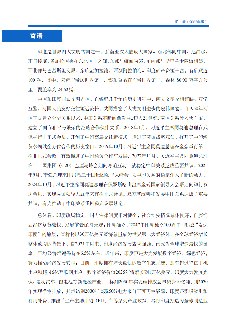 总体看,印度政局稳定,国内法律制度相对健全,社会治安情况总体良好,自疫情后经济复苏较快,发展前景保持乐观。印度确立了2047年印度独立100周年时建成“发达印度”的愿景,宣称将以30万亿美元经济总量成为世界第二大经济体。在全球经济增长整体放缓的背景下,自2021年以来,印度经济发展表现强劲,已成为全球增速最快的国家,平均经济增速保持在6.5%左右。近年来,印度更是大力发展数字经济、绿色经济,努力推动经济发展转型。目前,印度拥有增长最快的数字生态系统,拥有超过12亿手机用户和超过6亿互联网用户,数字经济价值2025年将增长到1万亿美元。印度大力发展光伏、电动汽车、锂电池等新能源产业,目标到2030年实现碳排放总量减少10亿吨,到2070年实现净零排放,并承诺到2030年实现50%电力来自于可再生能源。印度还积极吸引和利用外资,推出“生产激励计划(PLI)”等系列产业政策,希将印度打造为全球制造业中心。但是,近年来,印度对包括中国在内的陆地接壤国家实施了多项管控,印度客商