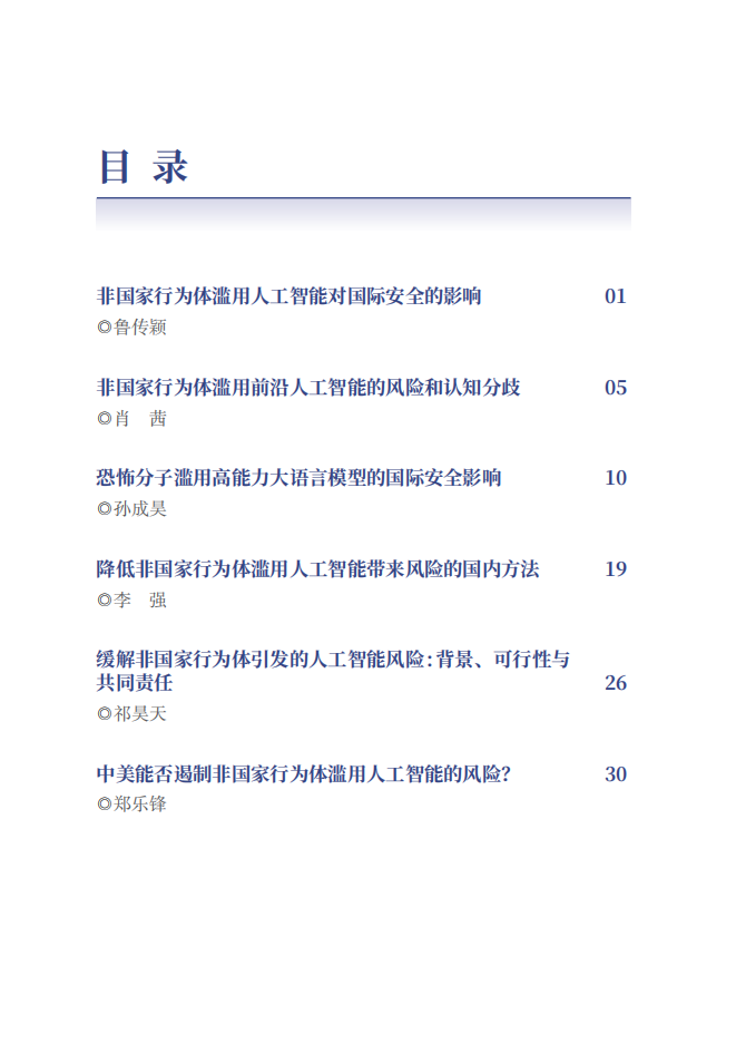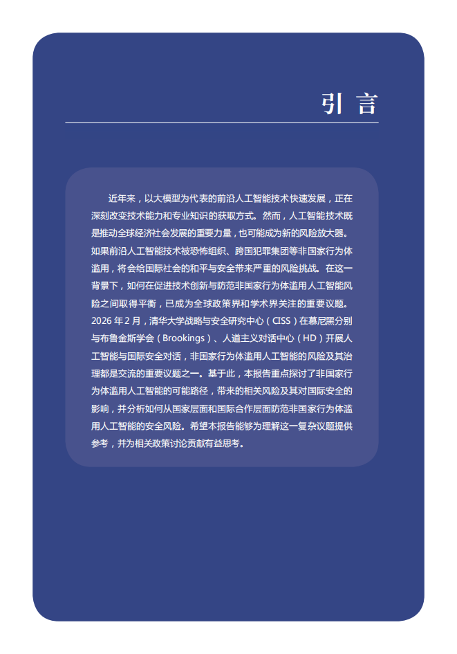 近年来,以大模型为代表的前沿人工智能技术快速发展,正在深刻改变技术能力和专业知识的获取方式。然而,人工智能技术既是推动全球经济社会发展的重要力量,也可能成为新的风险放大器。如果前沿人工智能技术被恐怖组织、跨国犯罪集团等非国家行为体滥用,将会给国际社会的和平与安全带来严重的风险挑战。在这一背景下,如何在促进技术创新与防范非国家行为体滥用人工智能风险之间取得平衡,已成为全球政策界和学术界关注的重要议题。2026年2月,清华大学战略与安全研究中心(CISS)在慕尼黑分别与布鲁金斯学会(Brookings)、人道主义对话中心(HD)开展人工智能与国际安全对话,非国家行为体滥用人工智能的风险及其治理都是交流的重要议题之一。基于此,本报告重点探讨了非国家行为体滥用人工智能的可能路径,带来的相关风险及其对国际安全的影响,并分析如何从国家层面和国际合作层面防范非国家行为体滥用人工智能的安全风险。希望本报告能够为理解这一复杂议题提供参考,并为相关政策讨论贡献有益思考。