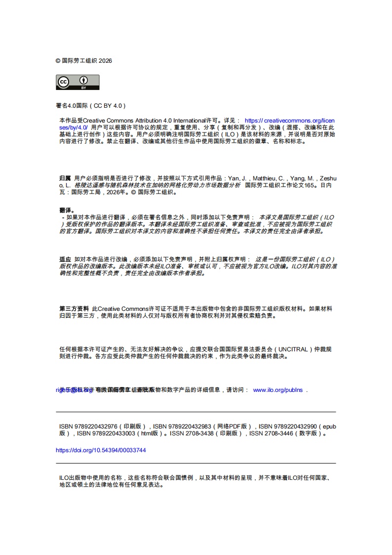本作品受Creative Commons Atribution 4.0 International许可。详见:https://creativecommons.orglicenses/by/4.0/用户可以根据许可协议的规定,重复使用、分享(复制和再分发)、改编(混搭、改编和在此基础上进行创作)这些内容。用户必须明确注明国际劳工组织(ILO)是该材料的来源,并说明是否对原始内容进行了修改。禁止在翻译、改编或其他衍生作品中使用国际劳工组织的徽章、名称和标志。