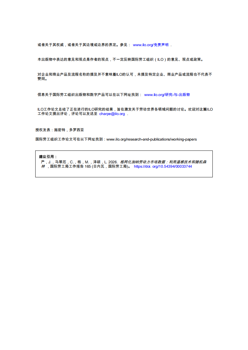 归属用户必须指明是否进行了修改,并按照以下方式引用作品:Yan,J.,Matthieu,C.,Yang.M.,Zeshuo,L.格陵达遥感与随机森林技术在加纳的网格化劳动力市场数据分析国际劳工组织工作论文165。日内瓦:国际劳工局,2026年。◎国际劳工组织。