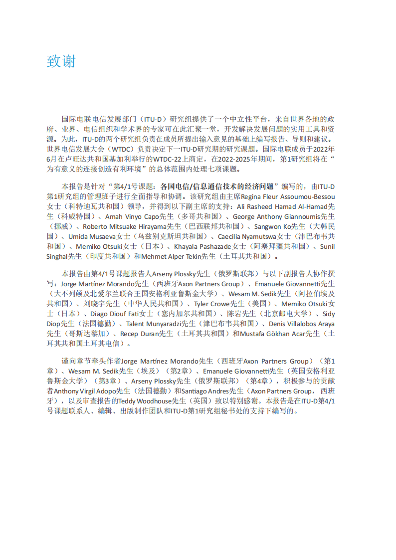 谨向章节牵头作者Jorge Martínez Morando先生(西班牙Axon Partners Group)(第1章)、Wesam M.Sedik先生(埃及)(第2章)、Emanuele Giovannetti先生(英国安格利亚鲁斯金大学)(第3章)、Arseny Plossky先生(俄罗斯联邦)(第4章),积极参与的贡献者Anthony Virgil Adopo先生(法国德勤)和Santiago Andres先生(Axon Partners Group,西班牙),以及审查报告的Teddy Woodhouse先生(英国)致以特别感谢。本报告是在ITU-D第4/1号课题联系人、编辑、出版制作团队和ITU-D第1研究组秘书处的支持下编写的。