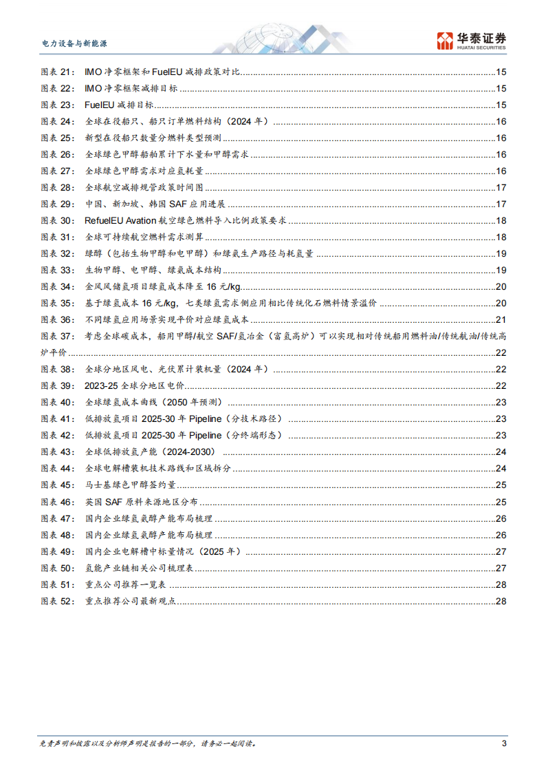 绿电方面,中国风光累计装机占全球约50%,且居民及工商业电价较美国及欧洲低30%-70%,未来新能源+储能一体化模式和绿电直连或进一步带动绿电降本。绿氢方面,2024年中国电解槽产能约48GW,占全球约60%,在适配规模化生产的ALK碱槽方面具备优势。绿色燃料方面,中国是海外绿醇和SAF原料核心供应商。马士基船用绿醇签约量中国企业贡献超50%,欧盟(2024)、英国(2025)供应SAF的原料中,中国占比38%、74%。