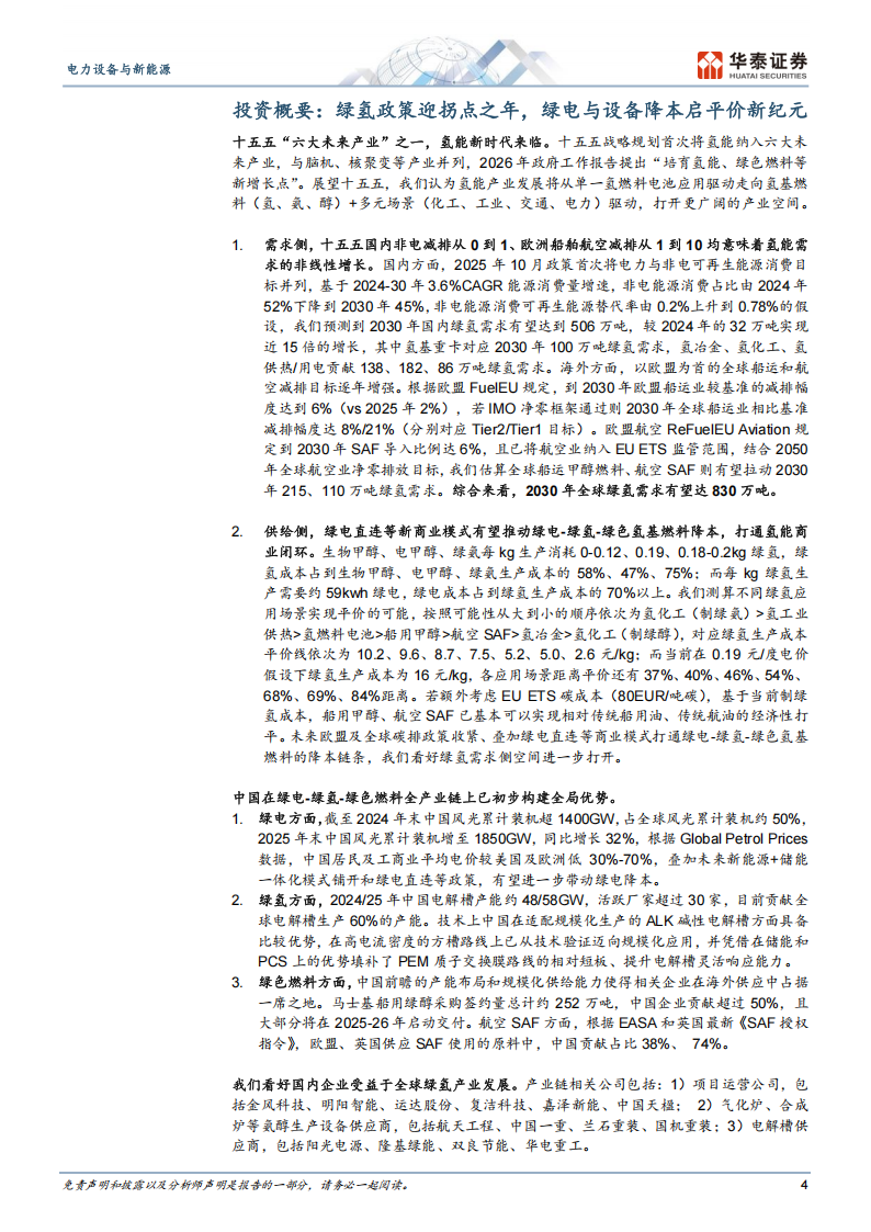 2026年政府工作报告提出“培育氢能、绿色燃料等新增长点”,“十五五”规划亦将氢能提升至“未来产业”战略高度,此外全球船运、航空碳排管控政策亦逐步收紧,海内外政策共振下氢能或迎来非线性增长拐点。我们看好绿氢需求放量下,国内项目运营商、氢氨醇设备供应商、电解槽供应商有望受益。