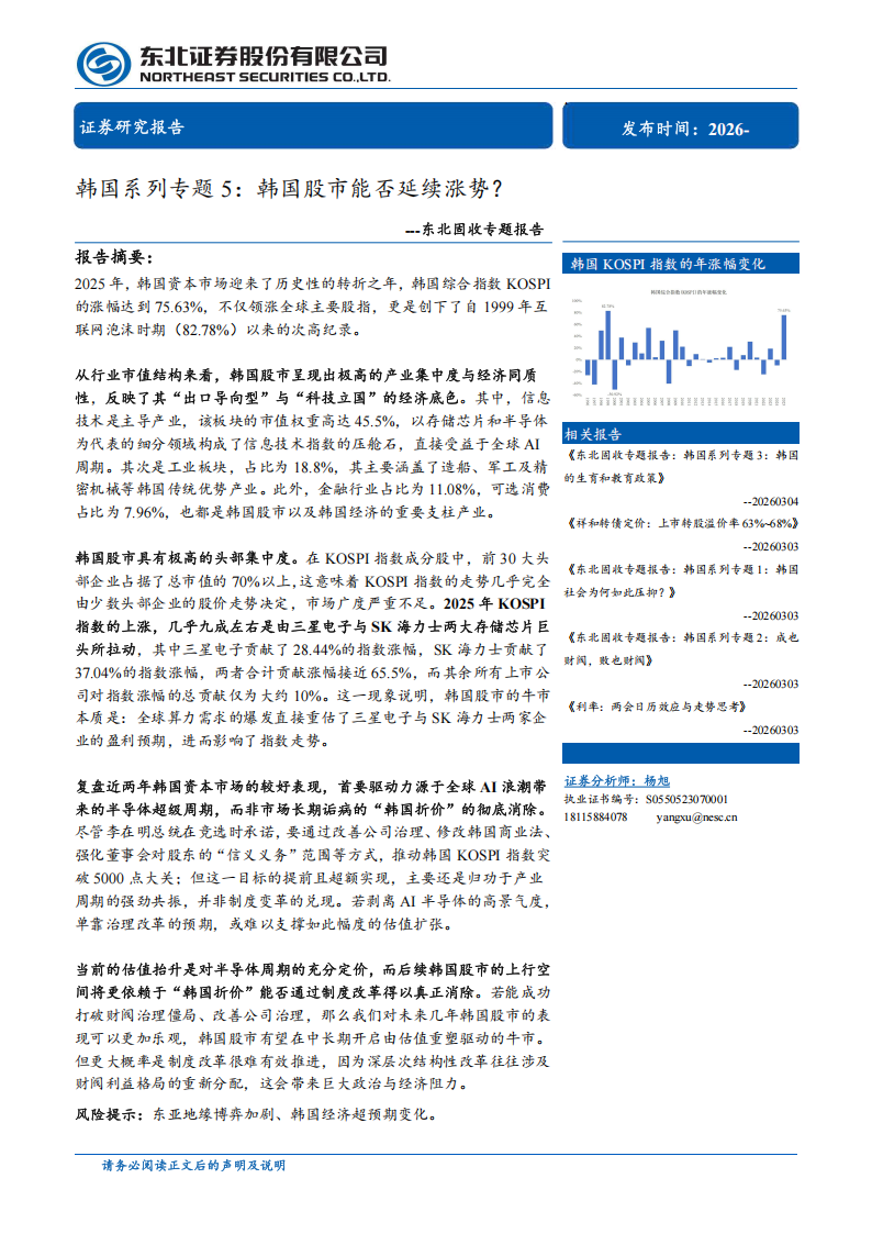 当前的估值抬升是对半导体周期的充分定价,而后续韩国股市的上行空间将更依赖于“韩国折价”能否通过制度改革得以真正消除。若能成功打破财阀治理僵局、改善公司治理,那么我们对未来几年韩国股市的表现可以更加乐观,韩国股市有望在中长期开启由估值重塑驱动的牛市。但更大概率是制度改革很难有效推进,因为深层次结构性改革往往涉及财阀利益格局的重新分配,这会带来巨大政治与经济阻力。