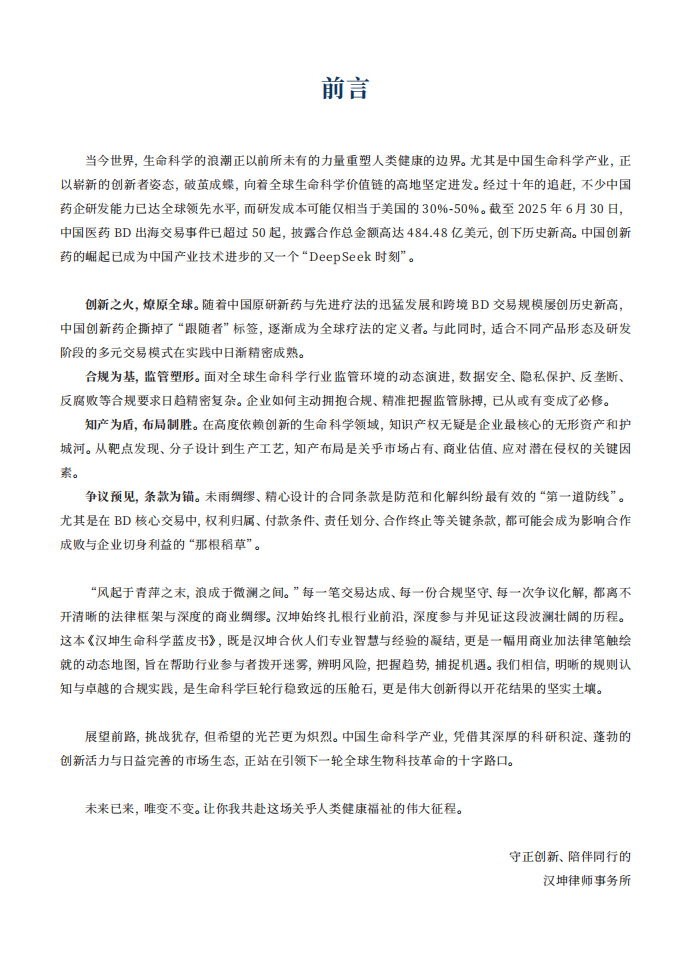 “风起于青萍之末,浪成于微澜之间。”每一笔交易达成、每一份合规坚守、每一次争议化解,都离不开清晰的法律框架与深度的商业绸缪。汉坤始终扎根行业前沿,深度参与并见证这段波澜壮阔的历程。这本《汉坤生命科学蓝皮书》,既是汉坤合伙人们专业智慧与经验的凝结,更是一幅用商业加法律笔触绘就的动态地图,旨在帮助行业参与者拨开迷雾,辨明风险,把握趋势,捕捉机遇。我们相信,明晰的规则认知与卓越的合规实践,是生命科学巨轮行稳致远的压舱石,更是伟大创新得以开花结果的坚实土壤。
