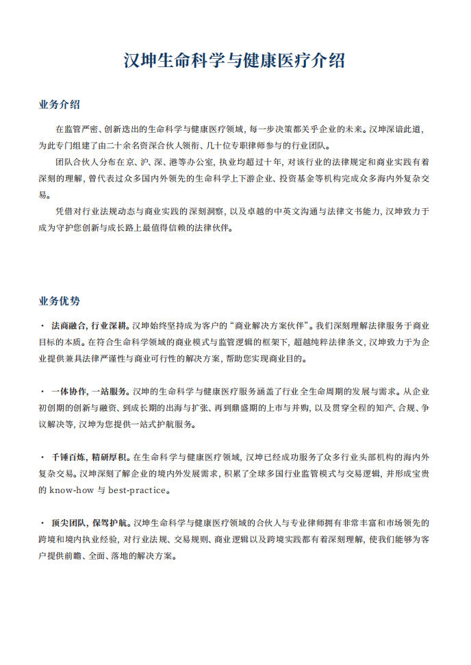 ·顶尖团队,保驾护航。汉坤生命科学与健康医疗领域的合伙人与专业律师拥有非常丰富和市场领先的