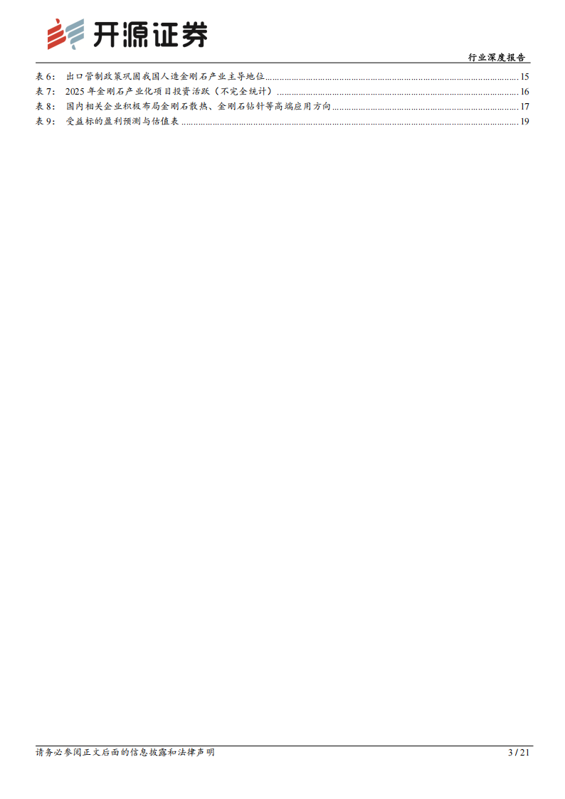 我们认为,人造金刚石行业正完成由传统耗材与消费替代品向AI成长赛道核心材料的产业属性切换,2026年有望成为其在AI领域产业化应用的0-1实质性拐点。金刚石散热与金刚石钻针分别切入算力系统热管理与高阶PCB制造核心环节,突破算力释放与制造升级两大瓶颈,深度绑定AI算力这一长周期、高增长的战略赛道。与过去依赖制造业景气度或消费周期的增长模式不同,本轮金刚石行业的需求源于算力基础设施升级所创造的增量需求。随着两大应用逐步完成客户导入与实际交付,行业由技术验证阶段迈入产业化落地阶段,估值体系有望迎来系统性重估。