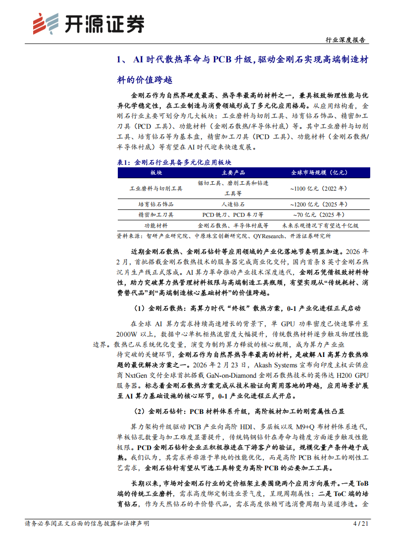 金刚石作为自然界硬度最高、热导率最高的材料之一,兼具极致物理性能与优异化学稳定性,在工业制造与消费领域形成了多元化应用格局。从应用结构看,金刚石行业主要可划分为几大板块:工业磨料与切削工具、培育钻石饰品、精密加工刀具(PCD工具)、功能材料(金刚石散热/半导体衬底)等。其中工业磨料与切削工具、培育钻石等为基本盘,精密加工刀具(PCD工具)、功能材料(金刚石散热/半导体衬底)等有望在AI时代迎来快速发展。近期金刚石散热、金刚石钻针等应用领域的产业化落地节奏明显加速。2026年2月,首批搭载金刚石散热技术的服务器完成商业化交付,国内首条8英寸金刚石热沉片生产线正式落成。AI算力革命推动产业技术深度迭代,金刚石凭借极致材料特性,助力突破算力热管理材料极限与高端制造工具瓶颈,有望实现从“传统耗材、消费替代品”到“高端制造核心基础材料”的价值跨越。
