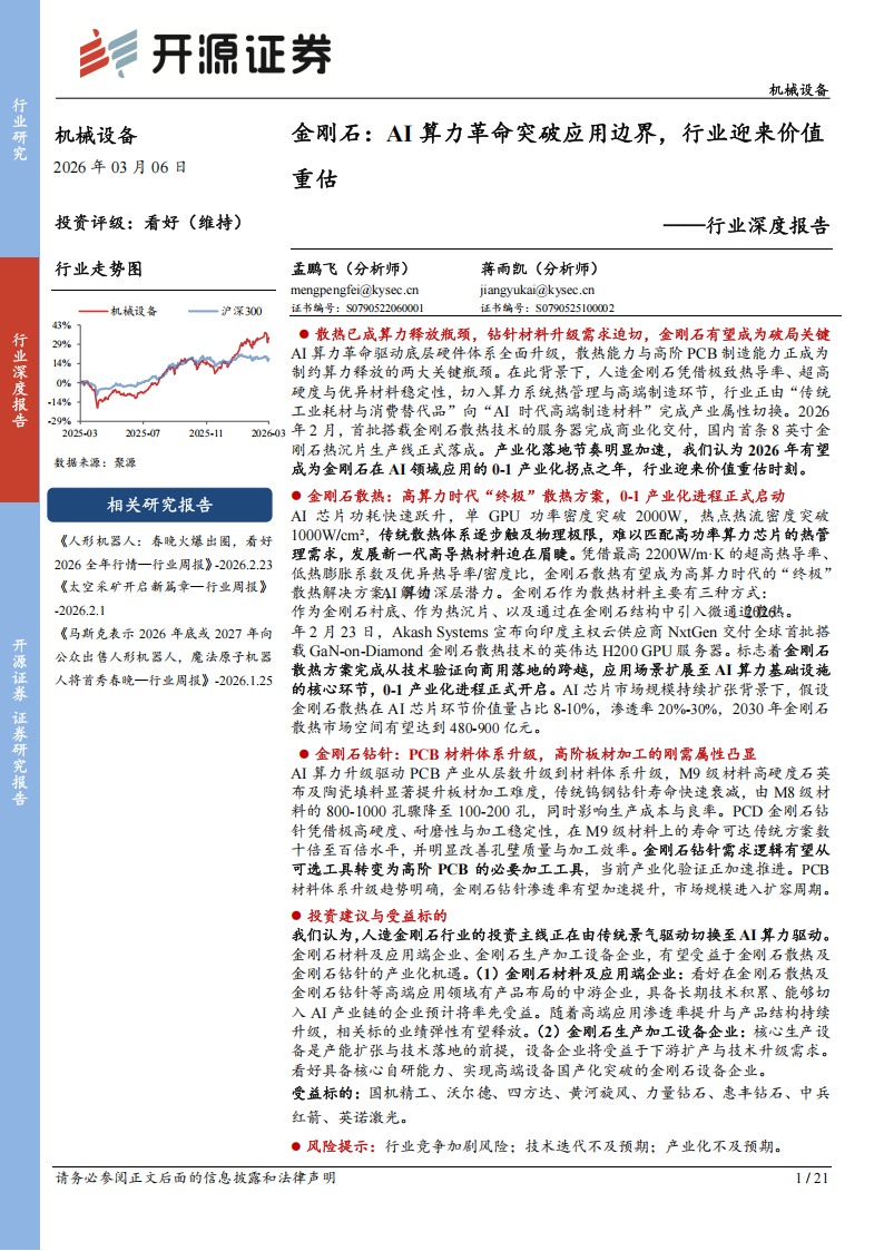 我们认为,人造金刚石行业的投资主线正在由传统景气驱动切换至AI算力驱动。金刚石材料及应用端企业、金刚石生产加工设备企业,有望受益于金刚石散热及金刚石钻针的产业化机遇。(1)金刚石材料及应用端企业:看好在金刚石散热及金刚石钻针等高端应用领域有产品布局的中游企业,具备长期技术积累、能够切入AI产业链的企业预计将率先受益。随着高端应用渗透率提升与产品结构持续升级,相关标的业绩弹性有望释放。(2)金刚石生产加工设备企业:核心生产设备是产能扩张与技术落地的前提,设备企业将受益于下游扩产与技术升级需求。看好具备核心自研能力、实现高端设备国产化突破的金刚石设备企业。
