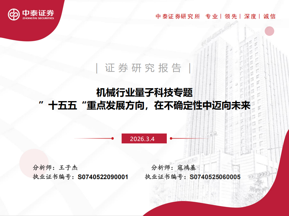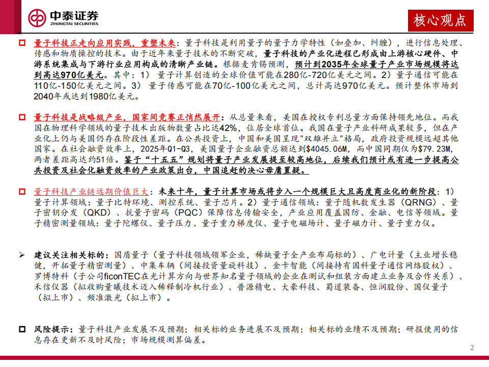 风险提示:量子科技产业发展不及预期;相关标的业务进展不及预期;相关标的业绩不及预期;研报使用的信息存在更新不及时风险;市场规模测算偏差。