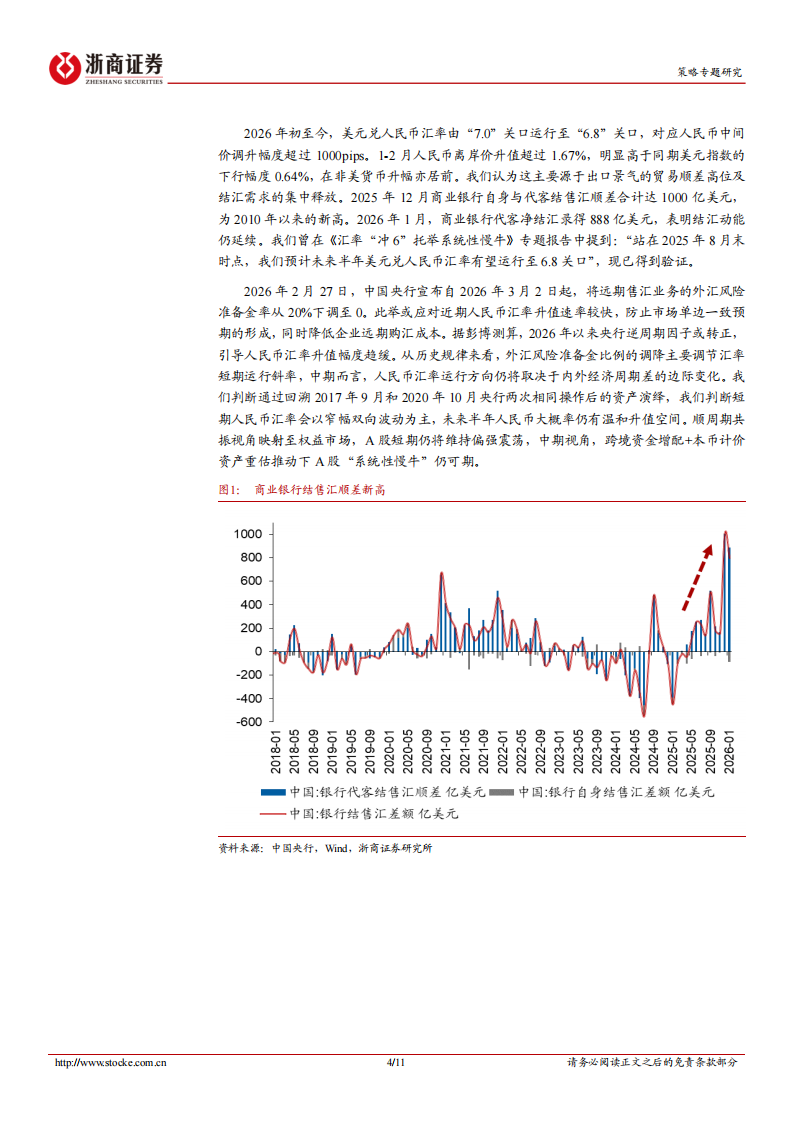 (2)2020年10月10日:中-美国债为正利差,外资增配叠加国内经济先于海外口 央行外汇风险准备金率调降影响展望复苏下的盈利改善,汇率明显升值,A股亦处于牛市周期。宣布日-2022年2月25日,美元兑人民币离岸汇率由6.68运行至6.31。A股短期震荡后,中期继续走牛。宣布日-2021年2月18日,上证指数区间涨幅为14.21%。2026年初至今,美元兑人民币汇率由“7.0”关口运行至“6.8”关口,对应人民币中间价调升幅度超过1000pips。1-2月人民币离岸价升值超过1.67%,明显高于同期美元指数的下行幅度0.64%,在非美货币升幅亦居前。我们认为这主要源于出口景气的贸易顺差高位及结汇需求的集中释放。2025年12月商业银行自身与代客结售汇顺差合计达1000亿美元,为2010年以来的新高。2026年1月,商业银行代客净结汇录得888亿美元,表明结汇动能仍延续。我们曾在《汇率“冲6”托举系统性慢牛》专题报告中提到:“站在2025年8月末时点,我们预计未来半年美元兑人民币汇率有望运行至6.8关口”,现已得到验证。
