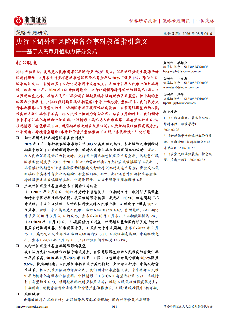 2026年初至今,美元兑人民币离岸汇率运行至“6.8”关口,汇率的强势或主要源于结汇动能释放。2月末央行宣布将远期售汇风险准备金率从20%下调至0%,降低企业远期购汇成本。彭博测算下央行逆周期因子或有发力,有助于引导人民币升值斜率趋缓。回溯2017年、2020年H2升值周期中,央行相同调降操作均伴随弱美元+国内出口强劲双重支撑。后续人民币汇率分别在短期呈现小幅趋贬和区间震荡,但中期均重回温和升值轨道。上证指数则均呈现短期震荡+中期上涨态势。整体而言,我们认为央行本次操作以信号意义为主,短期汇率或呈现窄幅双向波动。当前通胀调整后的人民币实际有效汇率水平不高。据人民币升值动力评分公式,站在3月初时点,我们预计未来半年汇率仍有温和升值空间,中性情形下美元兑人民币离岸汇率有望运行至6.73,乐观情形下有望触及6.70。顺周期共振映射至权益市场,A股短期或以偏强震荡为主,中期视角,跨境资金增配+本币计价资产重估推动下A股“系统性慢牛”仍可期。