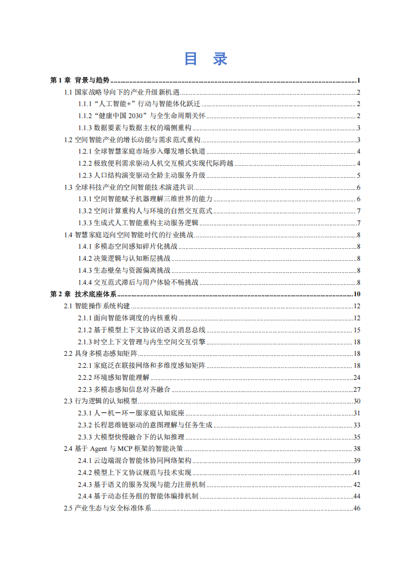 站在全球科技革命与社会变革的交汇点,智慧家庭正经历从万物互联向空间智能、认知智能的历史性转型。这不仅是硬件产业的升级,更是行业从“技术驱动被动控制”向“以人为本主动服务”转型的必经之路。当前产业正处于从生态割裂向全域协同演进的关键窗口期,人口结构的深度老龄化与居住需求的质变,正推动智能家电从简单的自动化工具向具备感知、思考与执行能力的有机生命体跃迁。本章深度解析了智慧家庭从被动响应向主动服务进化的时代必然,通过审视政策导向、社会变迁与市场逻辑,揭示了价值链重构下的演进路径。面对品牌孤岛与服务碎片化的严峻挑战,行业亟需以家庭大脑为核心重塑技术底座,通过空间智能驱动的主动服务与自然交互新范式,跨越数字鸿沟并开启一个安全、主动、更有温度的智慧生活新时代。