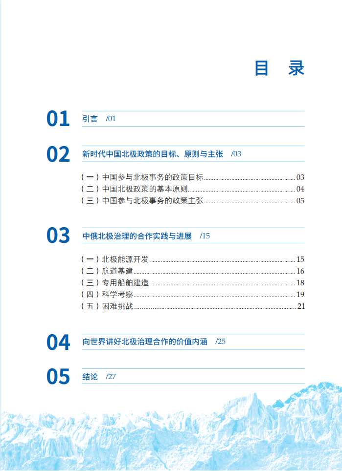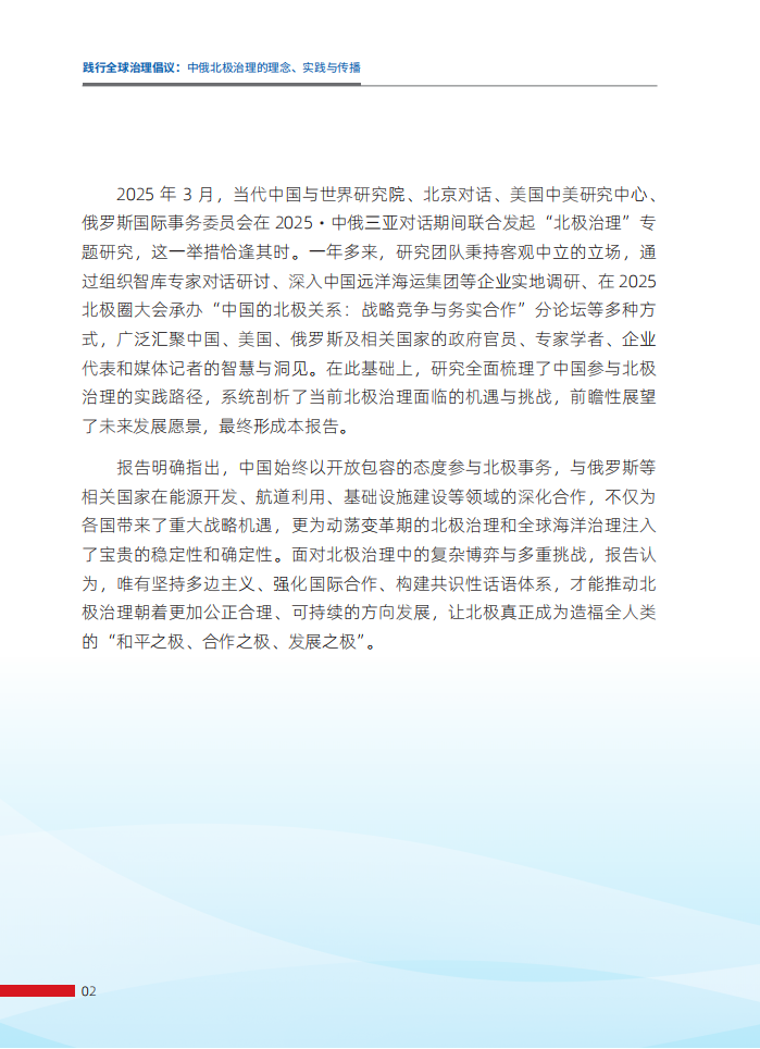 报告明确指出,中国始终以开放包容的态度参与北极事务,与俄罗斯等相关国家在能源开发、航道利用、基础设施建设等领域的深化合作,不仅为各国带来了重大战略机遇,更为动荡变革期的北极治理和全球海洋治理注入了宝贵的稳定性和确定性。面对北极治理中的复杂博弈与多重挑战,报告认为,唯有坚持多边主义、强化国际合作、构建共识性话语体系,才能推动北极治理朝着更加公正合理、可持续的方向发展,让北极真正成为造福全人类的“和平之极、合作之极、发展之极”。在经济全球化、区域一体化不断深入发展的背景下,北极在战略、经济、科研、环保、航道、资源等方面的价值不断提升,受到国际社会的普遍关注。北极问题已超出北极国家间问题和区域问题的范畴,涉及域外国家的利益和国际社会的整体利益,攸关人类生存与发展的共同命运,具有全球意义和国际影响。中国是北极事务的积极参与者、建设者和贡献者,努力为北极发展贡献中国智慧和中国力量。2018年发布的《中国的北极政策》白皮书,明确了北极政策的政策目标、基本原则与主要政策主张,为新时代中俄北极合作奠定了坚实基础。