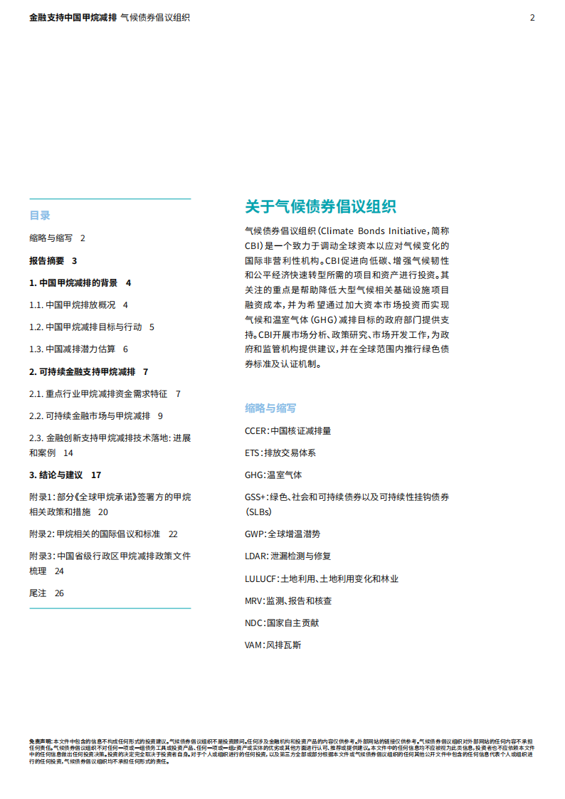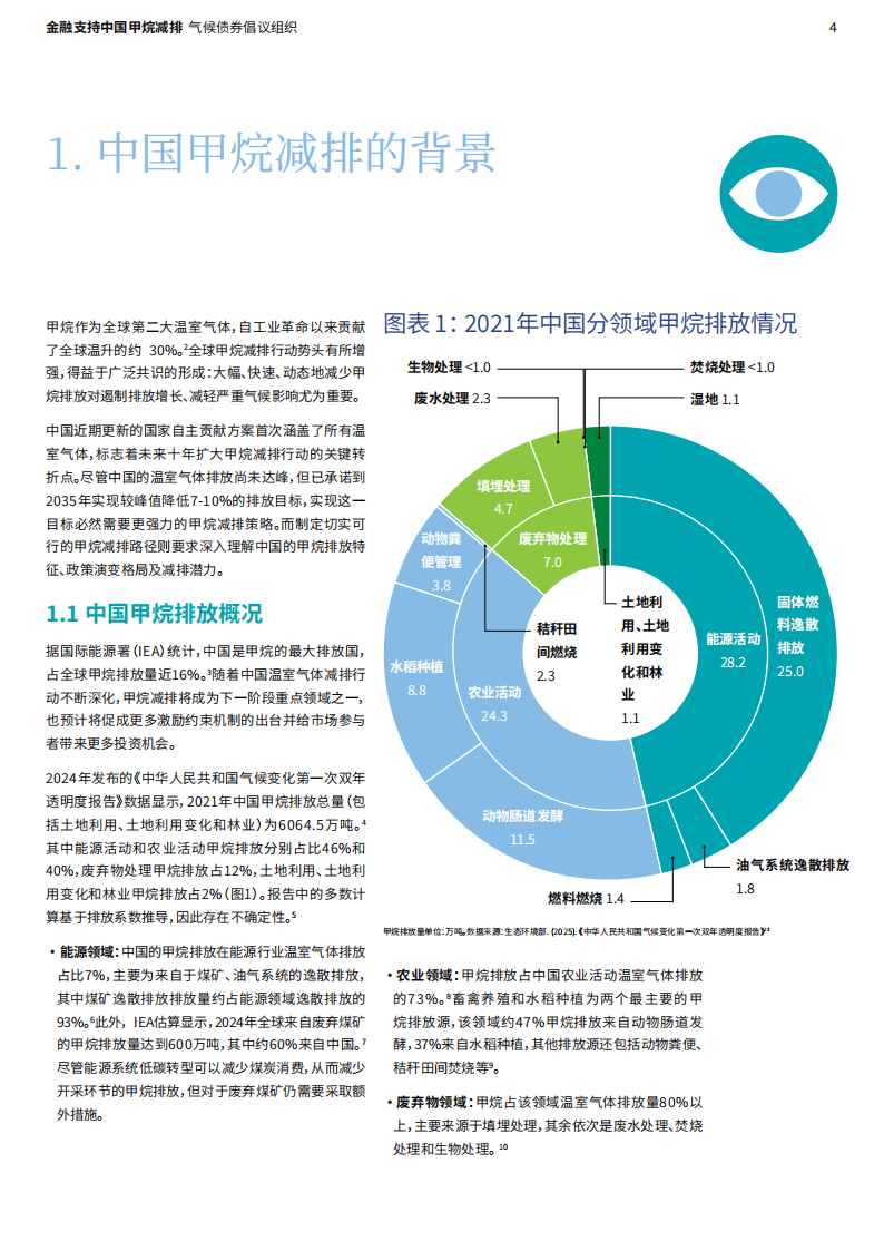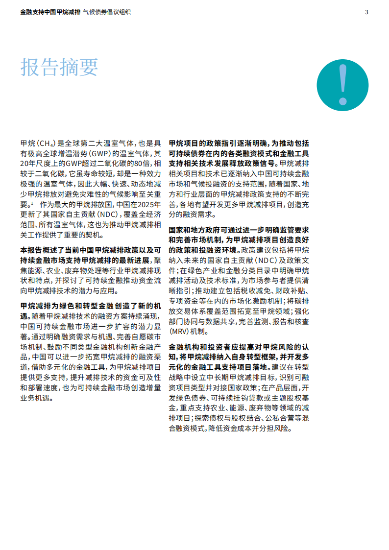 本报告概述了当前中国甲烷减排政策以及可持续金融市场支持甲烷减排的最新进展,聚焦能源、农业、废弃物处理等行业甲烷减排现状和特点,并探讨了可持续金融推动资金流向甲烷减排技术的潜力与应用。