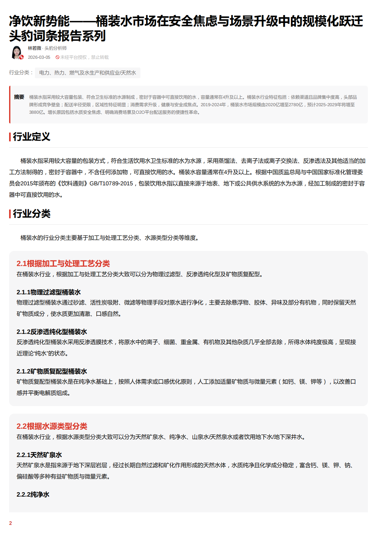 桶装水的行业分类主要基于加工与处理工艺分类、水源类型分类等维度。
