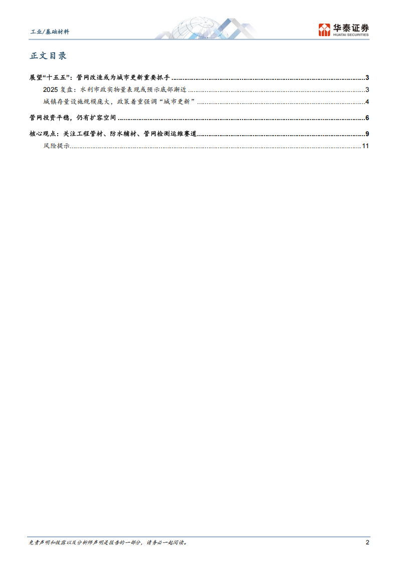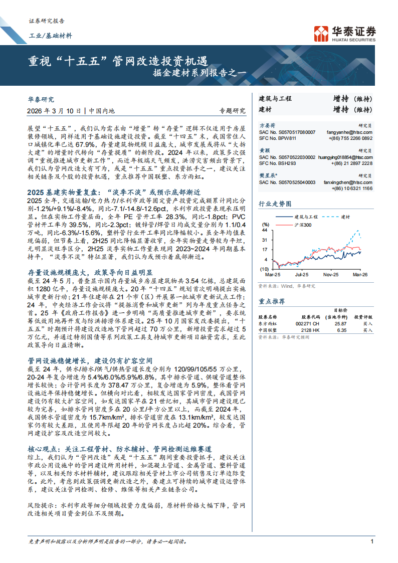 风险提示:水利市政等细分领域投资力度偏弱,原材料价格大幅下降,管网改造相关项目资金到位不及预期。