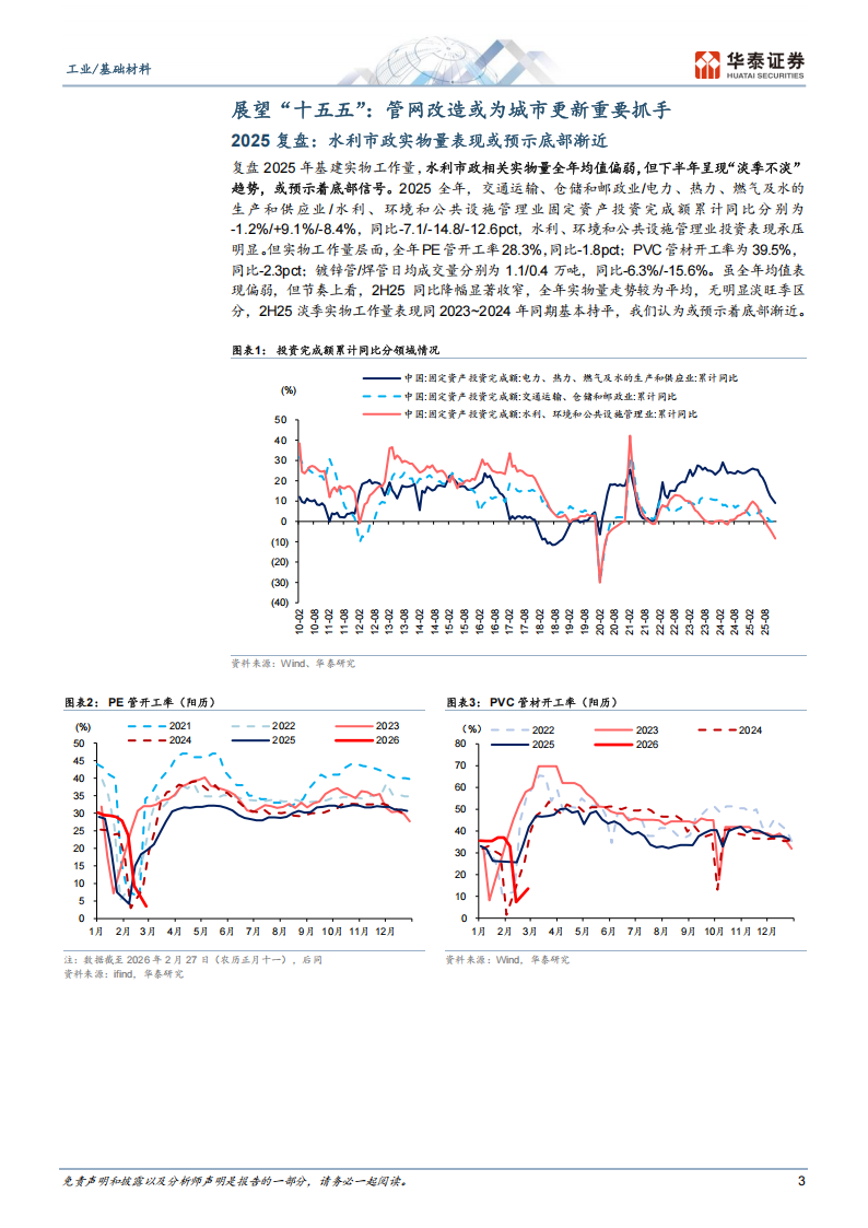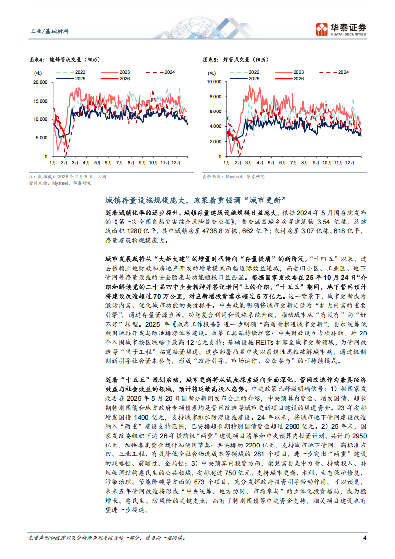 复盘2025年基建实物工作量,水利市政相关实物量全年均值偏弱,但下半年呈现“淡季不淡”趋势,或预示着底部信号。2025全年,交通运输、仓储和邮政业/电力、热力、燃气及水的生产和供应业/水利、环境和公共设施管理业固定资产投资完成额累计同比分别为-1.2%/+9.1%/-8.4%,同比-7.1/-14.8/-12.6pct,水利、环境和公共设施管理业投资表现承压明显。但实物工作量层面,全年PE管开工率28.3%,同比-1.8pct;PVC管材开工率为39.5%,同比-2.3pct;镀锌管/焊管日均成交量分别为1.1/0.4万吨,同比-6.3%/-15.6%。虽全年均值表现偏弱,但节奏上看,2H25同比降幅显著收窄,全年实物量走势较为平均,无明显淡旺季区分,2H25淡季实物工作量表现同2023~2024年同期基本持平,我们认为或预示着底部渐近。城镇存量设施规模庞大,政策着重强调“城市更新”