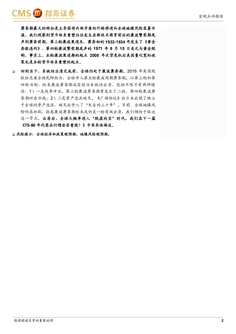 回到当下,系统性出清完成前,全球仍处于康波萧条期。2016年英国脱欧标志着全球民粹抬头,全球步入第五轮康波周期萧条期。以第三轮和第四轮为例,结束康波萧条期或需经历系统性出清,包括不限于有两种路径:1)一是战争冲击。第三轮康波萧条期曾发生了二战,第四轮康波萧条期对应冷战;2)二是资产泡沫破灭。《广场协议》后日本出现了独立于全球的资产泡沫,破灭后步入了“失去的三十年”。目前,全球地缘风险仍在加剧,距离康波萧条期结束或仍差一轮有效出清,我们倾向于临近这一节点。出清后,全球大概率进入“脱虚向实”时代,我们在下一篇《70-80年代商品行情会否重现?》中再具体阐述。