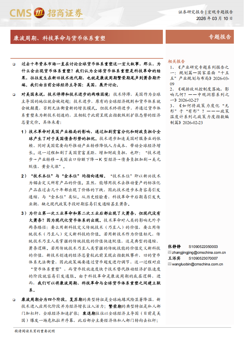 康波周期分为四个阶段。复苏期的典型特征是全球地缘风险显著降温,新技术进入应用化阶段并为经济增长注入活力;繁荣期的典型特征是私人部门加杠杆,全球经济加速扩张;衰退期往往以全球经济主导国(目前是美国)爆发一场危机拉开序幕,此后部分主要经济体私人部门转向去杠杆;萧条期最大的特征是主导国将内部矛盾向外转移进而全球地缘风险显著升温。我们观察到货币体系重塑往往发生在新技术萌芽前后的康波繁荣期尾声到萧条前期。第三轮康波衰退末、萧条初的1933-1934年发生了《黄金条款违约》、第四轮康波繁荣期尾声的1971年8月15日美元与黄金脱钩,事实上,本轮康波衰退期的起点2008年次贷危机后美国量化宽松政策也是本轮货币体系重塑的起点。
