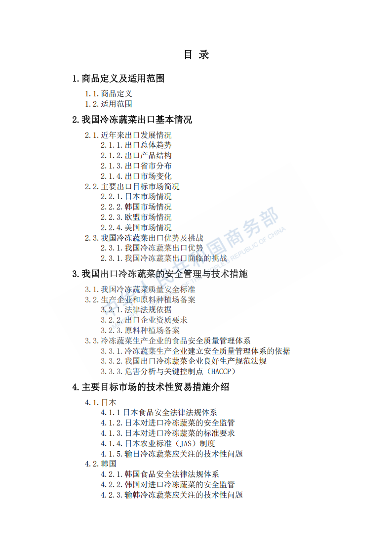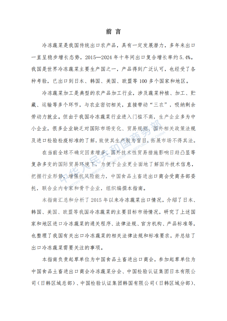 本指南汇总和分析了2015年以来冷冻蔬菜出口情况,介绍了日本、韩国、美国、欧盟等我国冷冻蔬菜的主要目标市场情况,研究了上述国家和地区进口冷冻蔬菜的通关程序、法律法规、官方机构、产品标准等,也整理了我国有关出口冷冻蔬菜的相关法律法规和标准要求,并总结了出口冷冻蔬菜需要关注的事项。