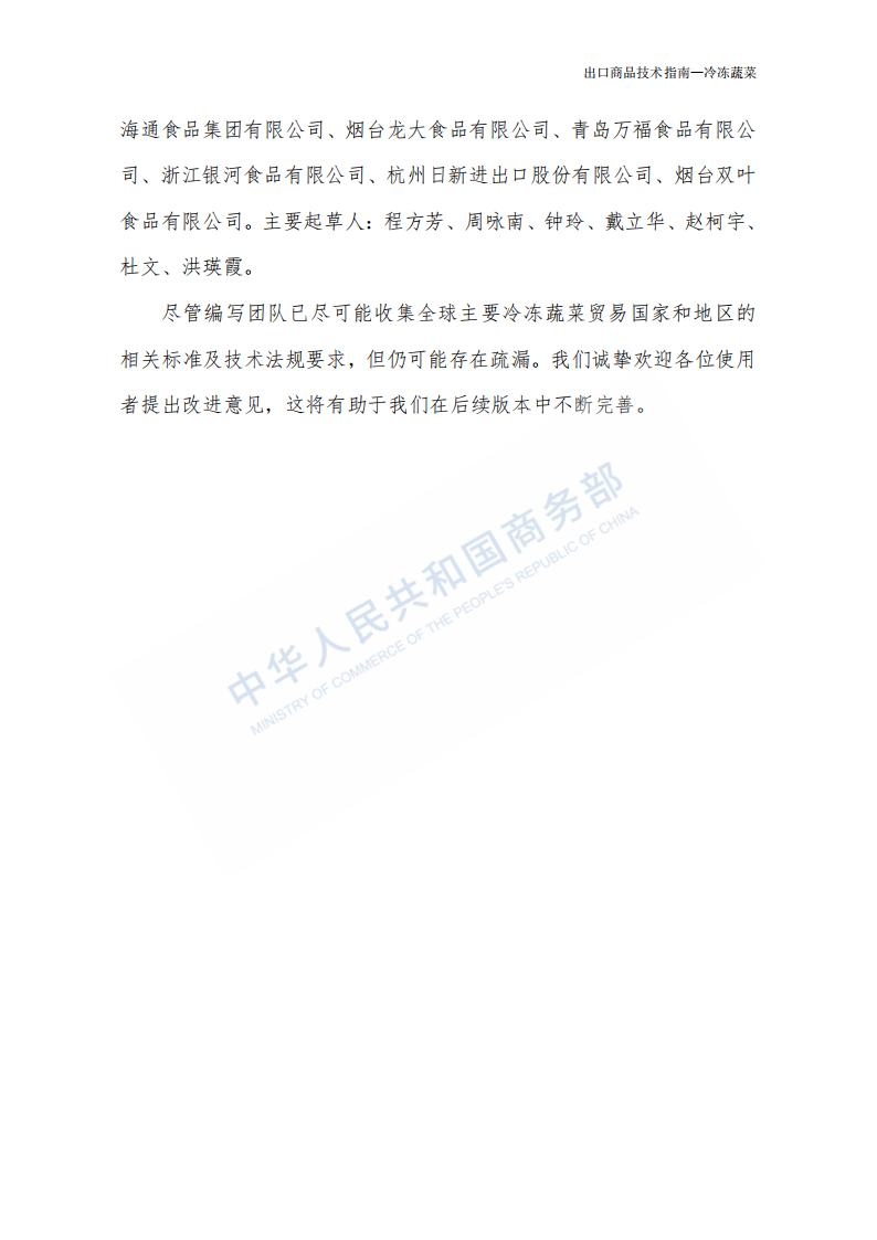 尽管编写团队已尽可能收集全球主要冷冻蔬菜贸易国家和地区的相关标准及技术法规要求,但仍可能存在疏漏。我们诚挚欢迎各位使用者提出改进意见,这将有助于我们在后续版本中不断完善。
