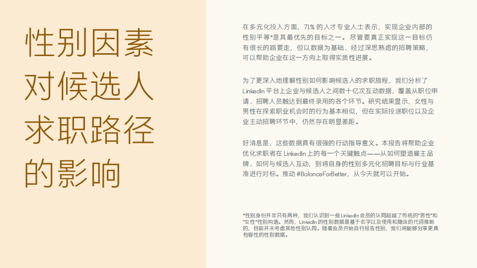 好消息是,这些数据具有很强的行动指导意义。本报告将帮助企业优化求职者在LinkedIn上的每一个关键触点一一从如何塑造雇主品牌、如何与候选人互动,到将自身的性别多元化招聘目标与行业基准进行对标。推动#BalanceForBetter,从今天就可以开始。
