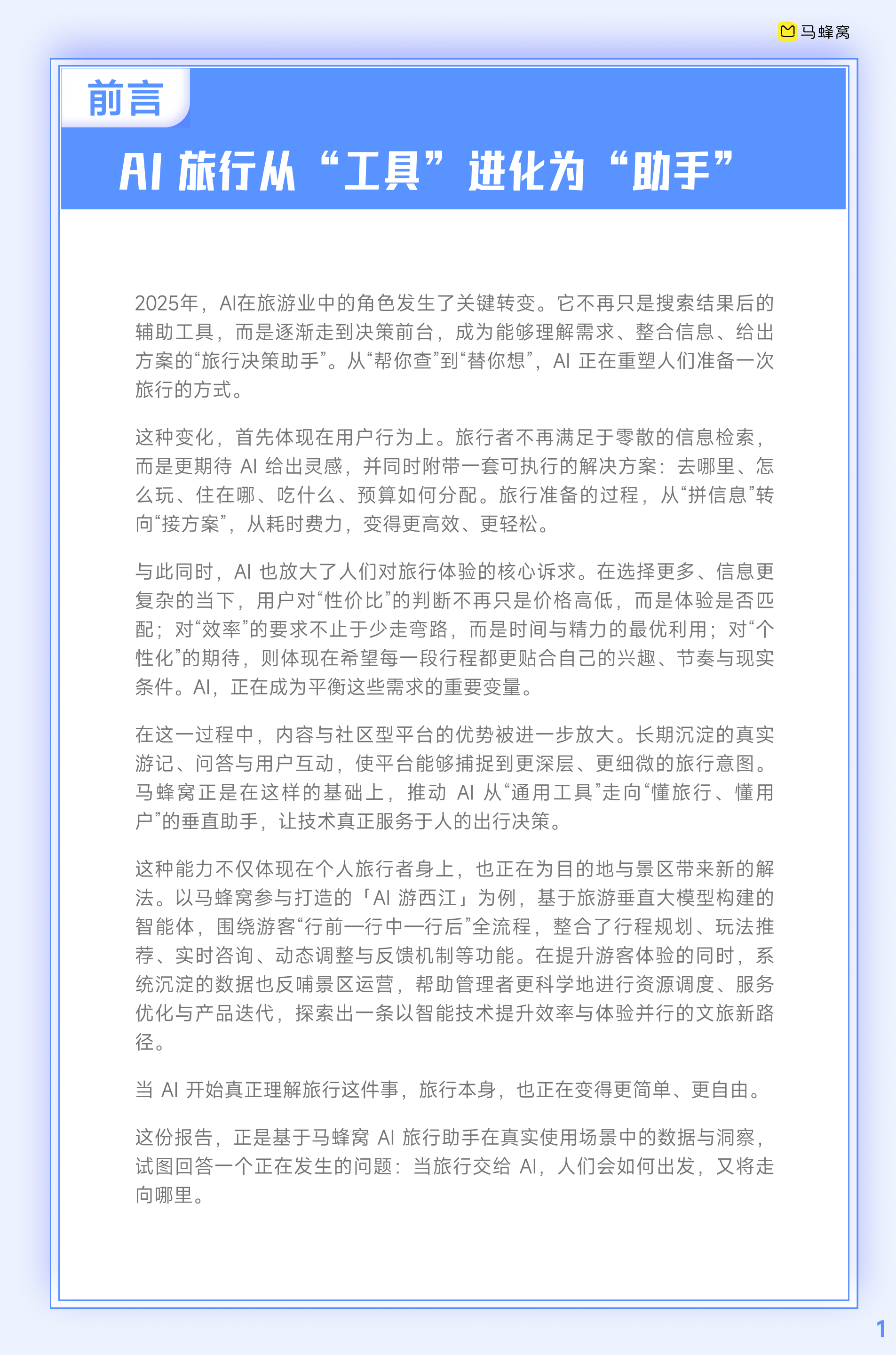 这份报告,正是基于马蜂窝AI旅行助手在真实使用场景中的数据与洞察,试图回答一个正在发生的问题:当旅行交给AI,人们会如何出发,又将走向哪里。