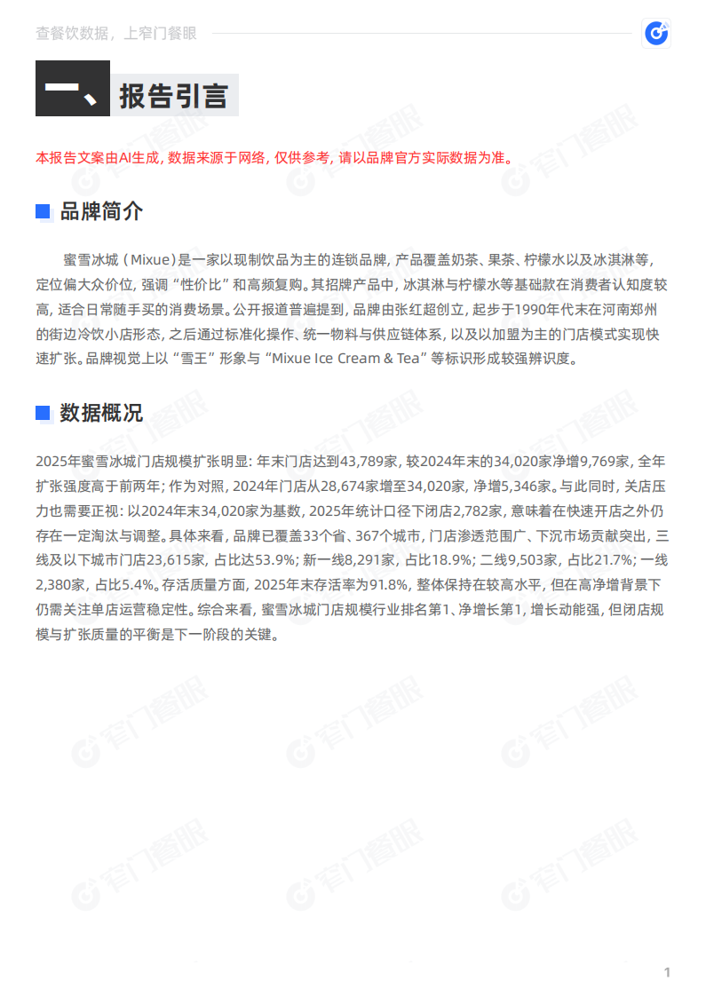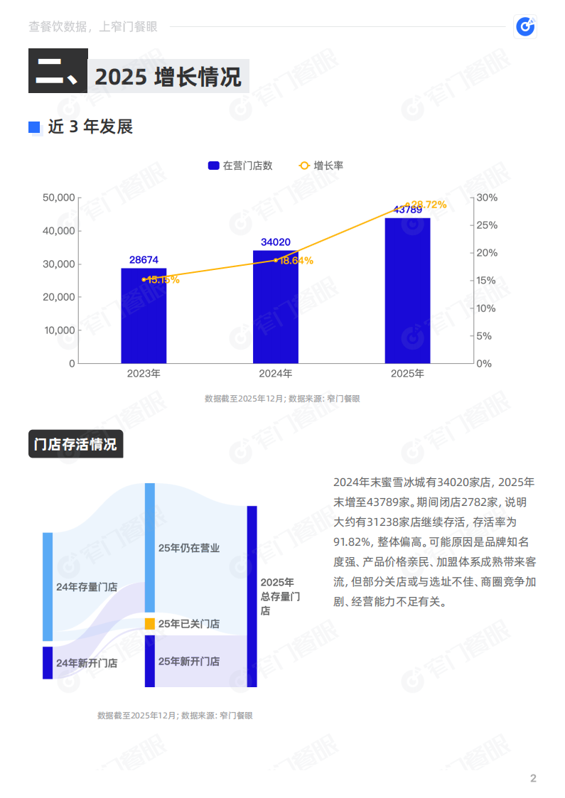 2025年蜜雪冰城门店规模扩张明显:年末门店达到43,789家,较2024年末的34,020家净增9,769家,全年扩张强度高于前两年;作为对照,2024年门店从28,674家增至34,020家,净增5,346家。与此同时,关店压力也需要正视:以2024年末34,020家为基数,2025年统计口径下闭店2,782家,意味着在快速开店之外仍存在一定淘汰与调整。具体来看,品牌已覆盖33个省、367个城市,门店渗透范围广、下沉市场贡献突出,三线及以下城市门店23,615家,占比达53.9%;新一线8,291家,占比18.9%;二线9,503家,占比21.7%;一线2,380家,占比5.4%。存活质量方面,2025年末存活率为91.8%,整体保持在较高水平,但在高净增背景下仍需关注单店运营稳定性。综合来看,蜜雪冰城门店规模行业排名第1、净增长第1,增长动能强,但闭店规模与扩张质量的平衡是下一阶段的关键。