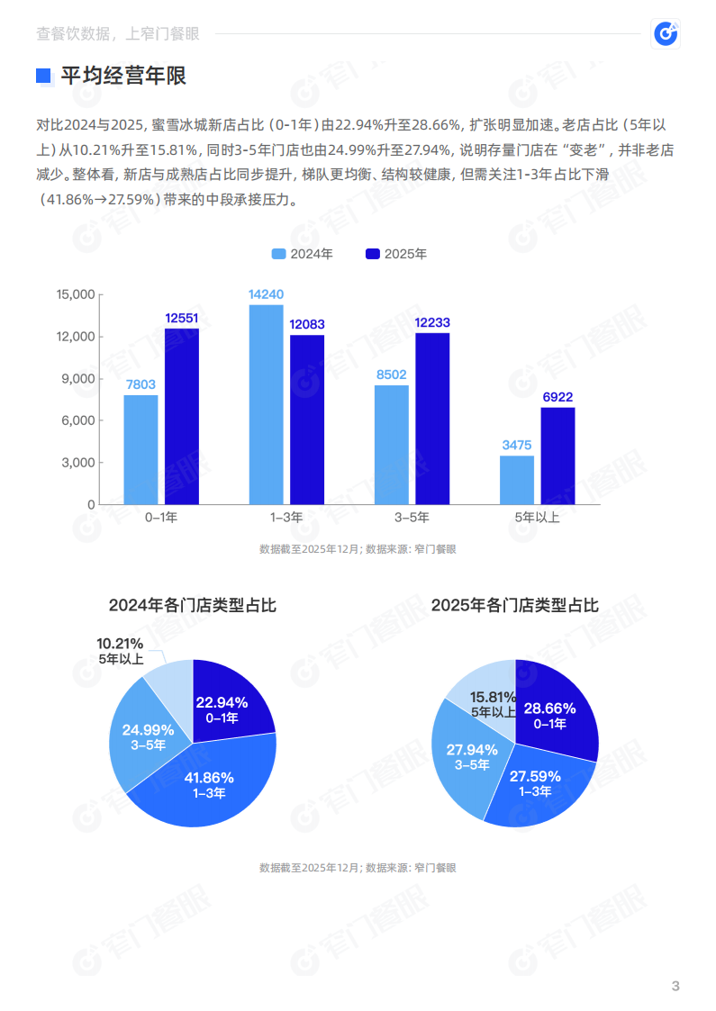 对比2024与2025,蜜雪冰城新店占比(0-1年)由22.94%升至28.66%,扩张明显加速。老店占比(5年以上)从10.21%升至15.81%,同时3-5年门店也由24.99%升至27.94%,说明存量门店在“变老”,并非老店减少。整体看,新店与成熟店占比同步提升,梯队更均衡、结构较健康,但需关注1-3年占比下滑(41.86%→27.59%)带来的中段承接压力。