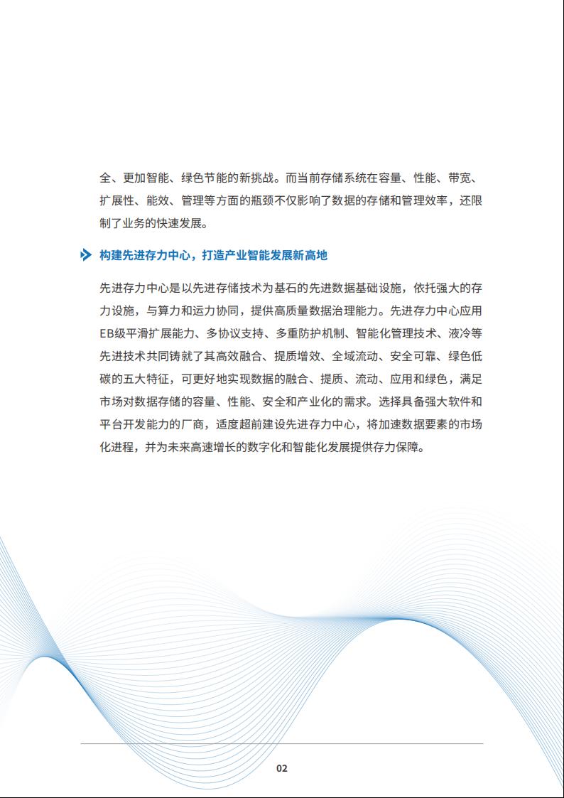 先进存力中心是以先进存储技术为基石的先进数据基础设施,依托强大的存力设施,与算力和运力协同,提供高质量数据治理能力。先进存力中心应用EB级平滑扩展能力、多协议支持、多重防护机制、智能化管理技术、液冷等先进技术共同铸就了其高效融合、提质增效、全域流动、安全可靠、绿色低碳的五大特征,可更好地实现数据的融合、提质、流动、应用和绿色,满足市场对数据存储的容量、性能、安全和产业化的需求。选择具备强大软件和平台开发能力的厂商,适度超前建设先进存力中心,将加速数据要素的市场化进程,并为未来高速增长的数字化和智能化发展提供存力保障。