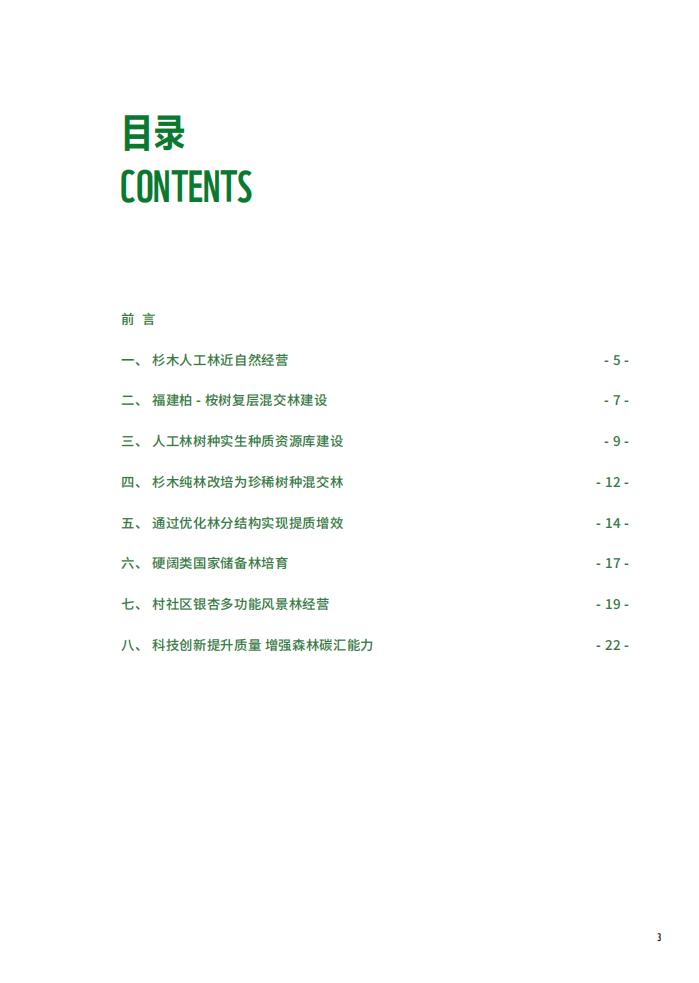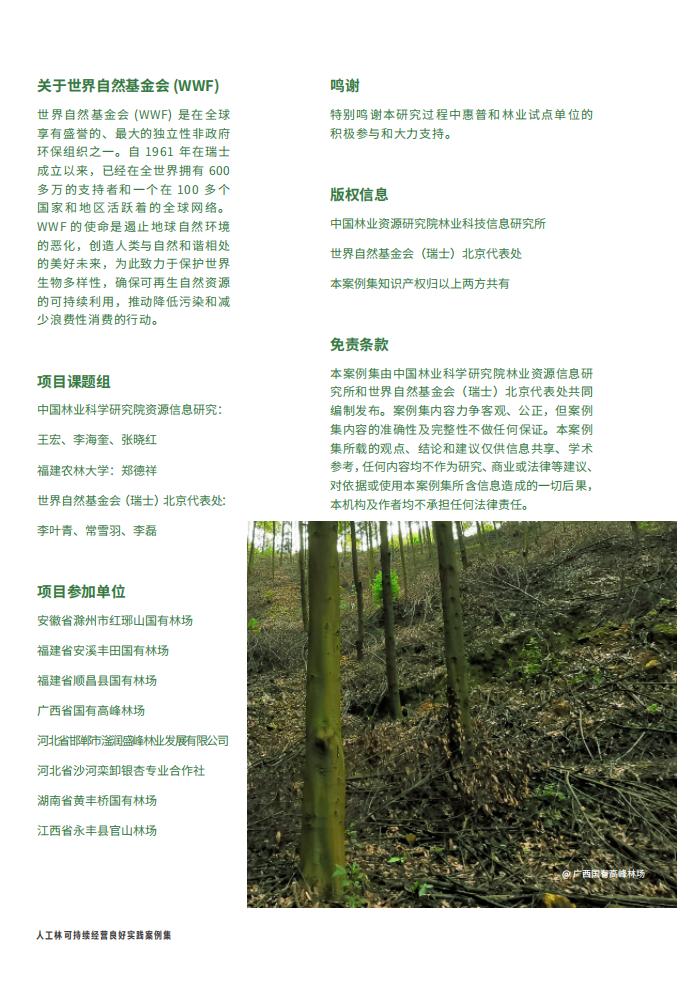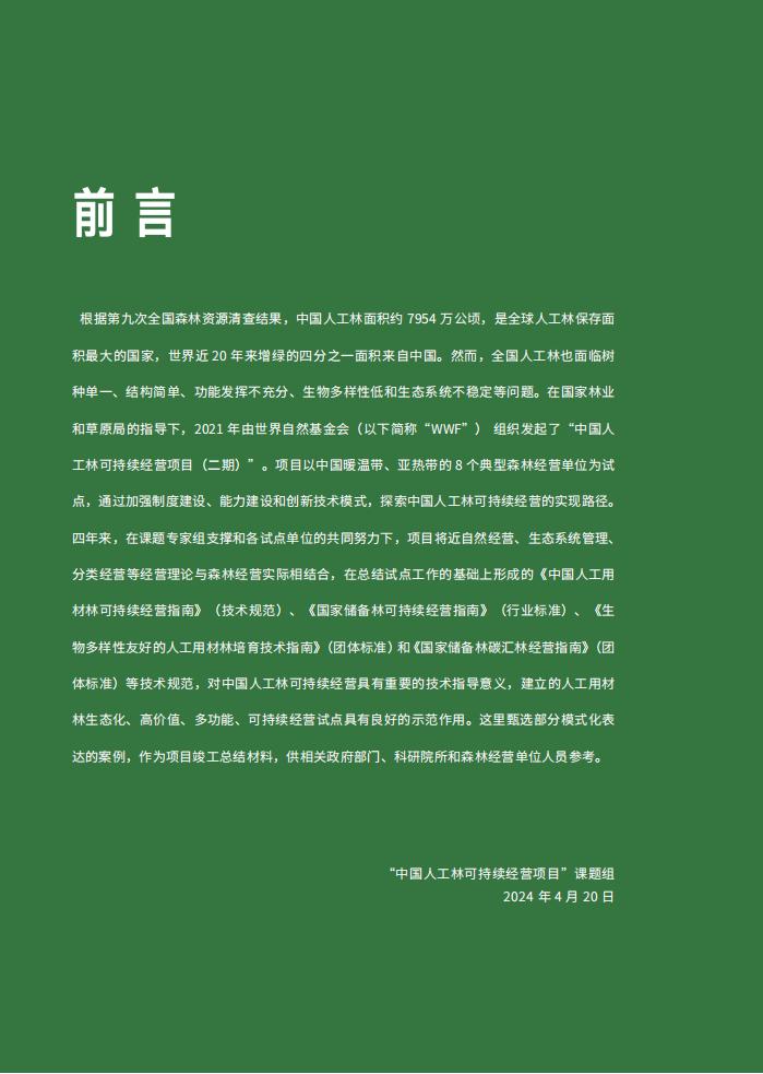 积最大的国家,世界近20年来增绿的四分之一面积来自中国。然而,全国人工林也面临树种单一、结构简单、功能发挥不充分、生物多样性低和生态系统不稳定等问题。在国家林业和草原局的指导下,2021年由世界自然基金会(以下简称“WWF”)组织发起了“中国人工林可持续经营项目(二期)”。项目以中国暖温带、亚热带的8个典型森林经营单位为试点,通过加强制度建设、能力建设和创新技术模式,探索中国人工林可持续经营的实现路径。四年来,在课题专家组支撑和各试点单位的共同努力下,项目将近自然经营、生态系统管理、分类经营等经营理论与森林经营实际相结合,在总结试点工作的基础上形成的《中国人工用材林可持续经营指南》(技术规范)、《国家储备林可持续经营指南》(行业标准)、《生物多样性友好的人工用材林培育技术指南》(团体标准)和《国家储备林碳汇林经营指南》(团体标准)等技术规范,对中国人工林可持续经营具有重要的技术指导意义,建立的人工用材林生态化、高价值、多功能、可持续经营试点具有良好的示范作用。这里甄选部分模式化表达的案例,作为项目竣工总结材料,供相关政府部门、科研院所和森林经营单位人员参考。