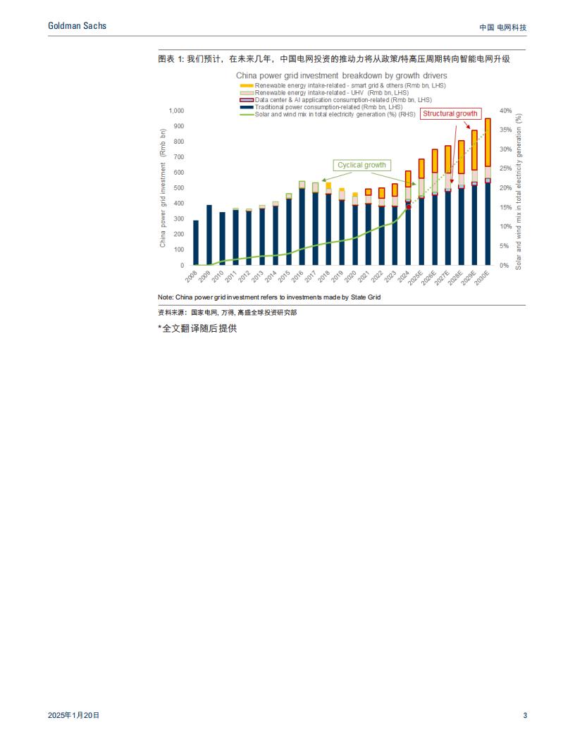 我们认为中国的电力系统即将迎来转型升级;我们预计,尤其是可再生能源消纳量的日益增长,加上来自数据中心和人工智能(AlD)用电量的小幅贡献,有望在2024-2030年的新增投资中占据近60%,电网总投资的年均复合增速将达到8%的稳健水平,智能电网在电网总支出中的占比将从2023年的13.7%升至2030年的16%,投资重点在于可实时监控、调度及实时处理数据的智能系统,从而实现高效的电力分配。2025年,在强有力的逆周期政策支持和特高压建设周期加快推进的背景下,我们预计中国的电网投资,具体而言是由国家电网作出的投资,将达到人民币6,900亿元的创纪录水平(同比增长13%),略高于人民币6,500亿元的全年目标。