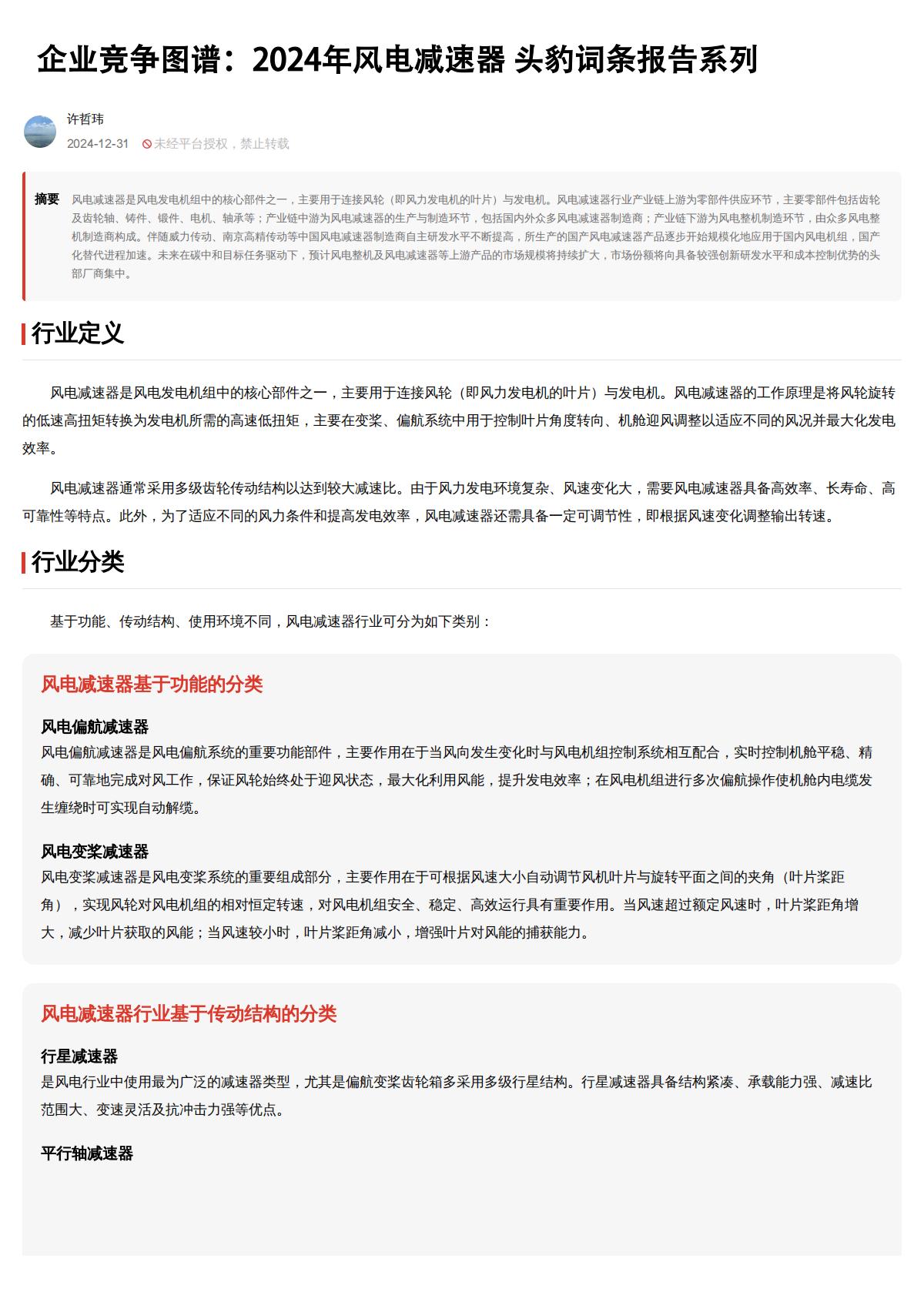 摘要 风电减速器是风电发电机组中的核心部件之一,主要用于连接风轮(即风力发电机的叶片)与发电机。风电减速器行业产业链上游为零部件供应环节,主要零部件包括齿轮及齿轮轴,铸件、锢件、电机、轴承等;产业链中游为风电减速器的生产与制造环节,包括国内外众多风电减速器制造商;产业链下游为风电整机制环节,由众多风电整机制造商构成,伴随成力传动、南京高精传动等中国风电减速器制造商自主研发水平不断提高,所生产的国产风电减速器产品逐步开始规模化地应用于国内风电机组,国产化替代进程加速。未来在破中和目标任务驱动下,预计风电整机及风电减速器等上游产品的市场规模将持练扩大,市场份颜将向具备较强合新研发水平和成本控制优势的头部厂商集中。