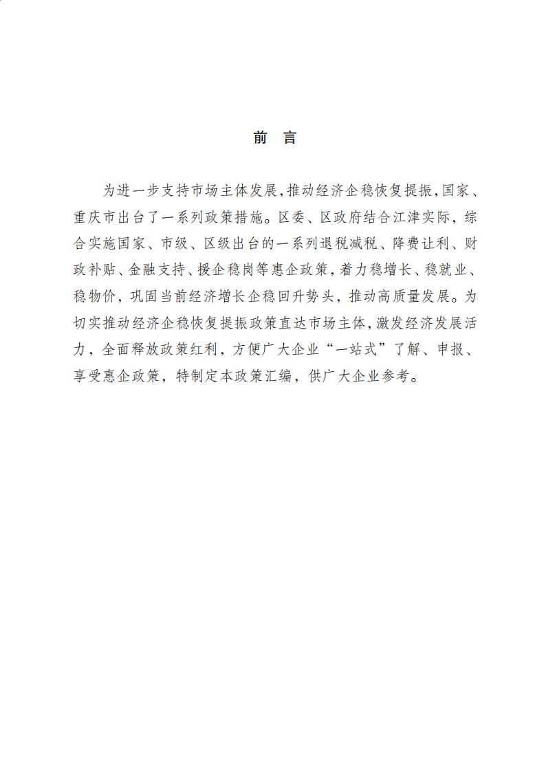 为进一步支持市场主体发展,推动经济企稳恢复提振,国家、重庆市出台了一系列政策措施。区委、区政府结合江津实际,综合实施国家、市级、区级出台的一系列退税减税、降费让利、财政补贴、金融支持、援企稳岗等惠企政策,着力稳增长、稳就业、稳物价,巩固当前经济增长企稳回升势头,推动高质量发展。为切实推动经济企稳恢复提振政策直达市场主体,激发经济发展活力,全面释放政策红利,方便广大企业“一站式”了解、申报、享受惠企政策,特制定本政策汇编,供广大企业参考。