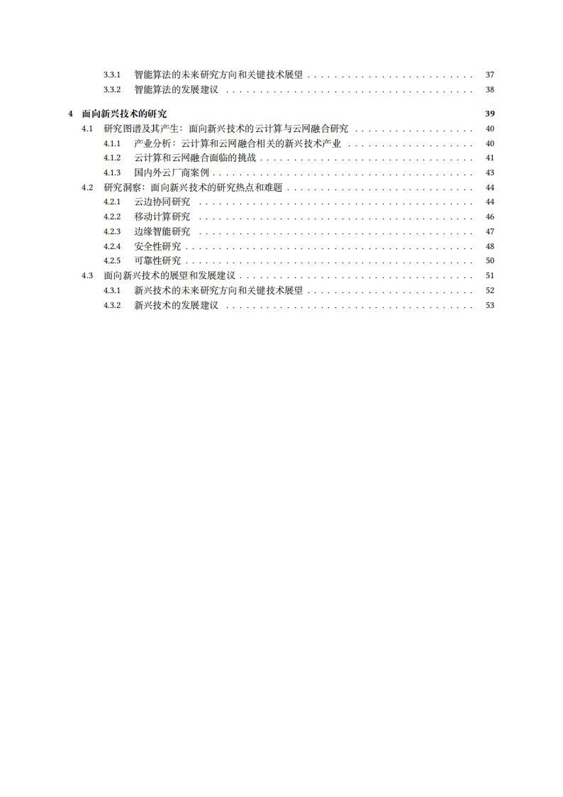 第四章面向新兴技术的研究探讨中,围绕工业互联网、智慧交通、智慧医疗、智慧政企、智慧教育等新兴技术领域对云计算和云网融合的需求展开。本章整理了国内外云厂商的相关案例,总结提炼出协同性、移动性、智能性、安全性、可靠性五个方面的挑战。通过对大量高水平论文的深度分析,本章总结了面对每个方面挑战的研究热点和研究难题。本章提出的发展建议包括推动云边协同化和智能化发展、强化安全性和合规性、推动智能化运维和管理等。