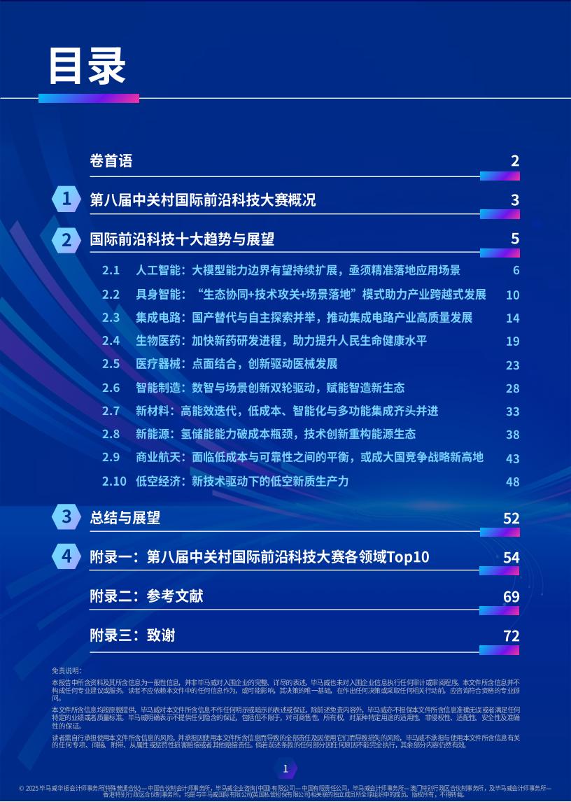 站在新的历史方位,科技创新已不仅是发展问题,更是生存问题。这份报告既是对过往创新成果的致敬,更是面向未来的行动宣言。期待通过我们的共同努力,让中关村的创新之火形成燎原之势,让十大赛道的突破性进展转化为高质量发展的强劲动能。毕马威愿与各界同仁携手,以专业力量服务国家战略,以创新思维破解发展难题,共同绘制属于这个伟大时代的科技蓝图。