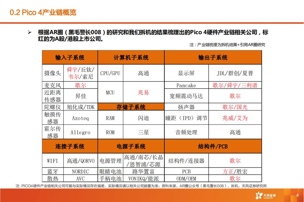 投资建议:从硬件优化+内容生态丰富,我们认为Pico 4有望成为一款更普及、亲民的VR产品,带动行业出货量提升;而明年或将推出的苹果MR有望成为一款质变的划时代产品。基于此我们建议紧密跟踪Pico和苹果产业链。围绕着本次Pico4拆机,建议重点关注歌尔股份(Pico链龙头)、舜宇光学(光学龙头)、韦尔股份(摄像头)、三利谱(光学膜)、兆威机电(瞳距调节模组)。苹果产业链我们建议重点关注立讯精密(苹果链龙头)、科瑞技术、领益智造、鹏鼎控股、蓝思科技。其余VRAR产业链建议关注:长盈精密、智立方、闻泰科技、世华科技、顺络电子、紫建电子、德赛电池、欣旺达、环旭电子、科森科技。
