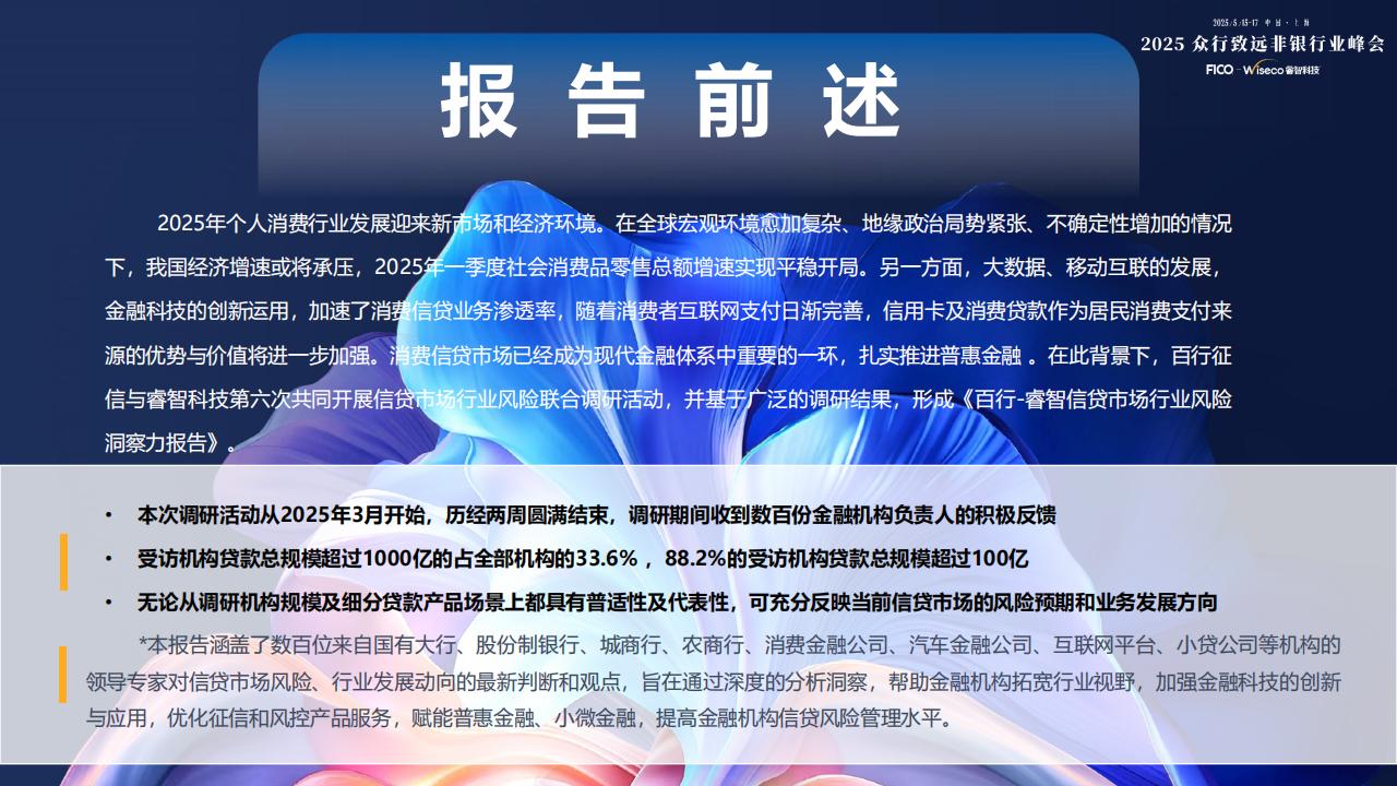 2025年个人消费行业发展迎来新市场和经济环境,在全球宏观环境愈加复杂、地缘政治局势紧张、不确定性增加的情况下,我国经济增速或将承压,2025年一季度社会消费品零售总额增速实现平稳开局。另一方面,大数据、移动互联的发展,金科技的创新运用,加速了消费信贷业务渗透率,随着消费者互联网支付日渐完善,信用卡及消费贷款作为居民消费支付来源的优势与价值将进一步加强。消费信货市场已经成为现代金融体系中重要的一环,扎实推进普惠金融。在此背景下,百行征信与睿智科技第六次共同开展信贷市场行业风险联合调研活动,并基于广泛的调研结果,形成《百行-睿智信贷市场行业风险洞察力报告》
